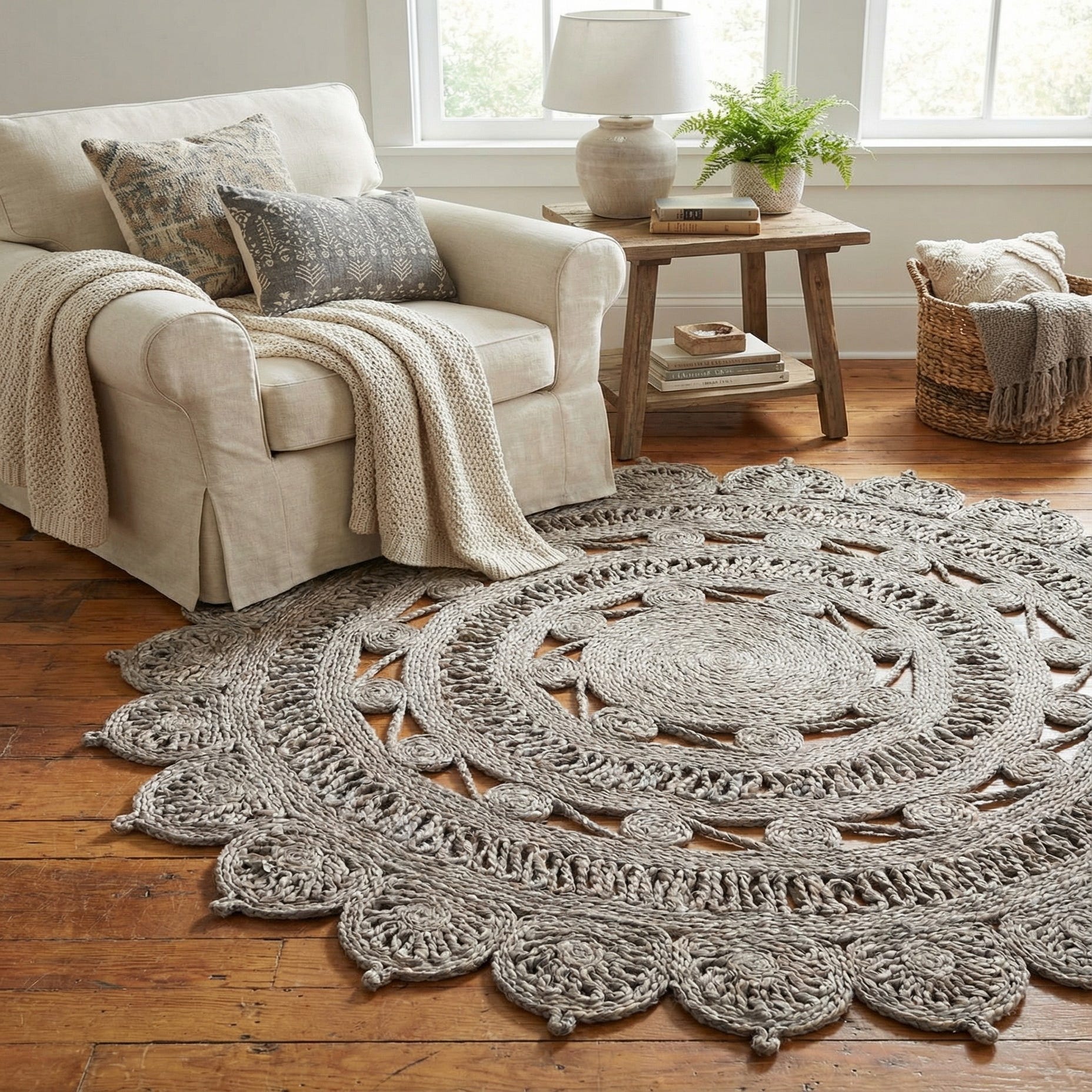 A round 4'1" gray jute rug with a textured, braided pattern and scalloped edges, suitable for various indoor spaces.