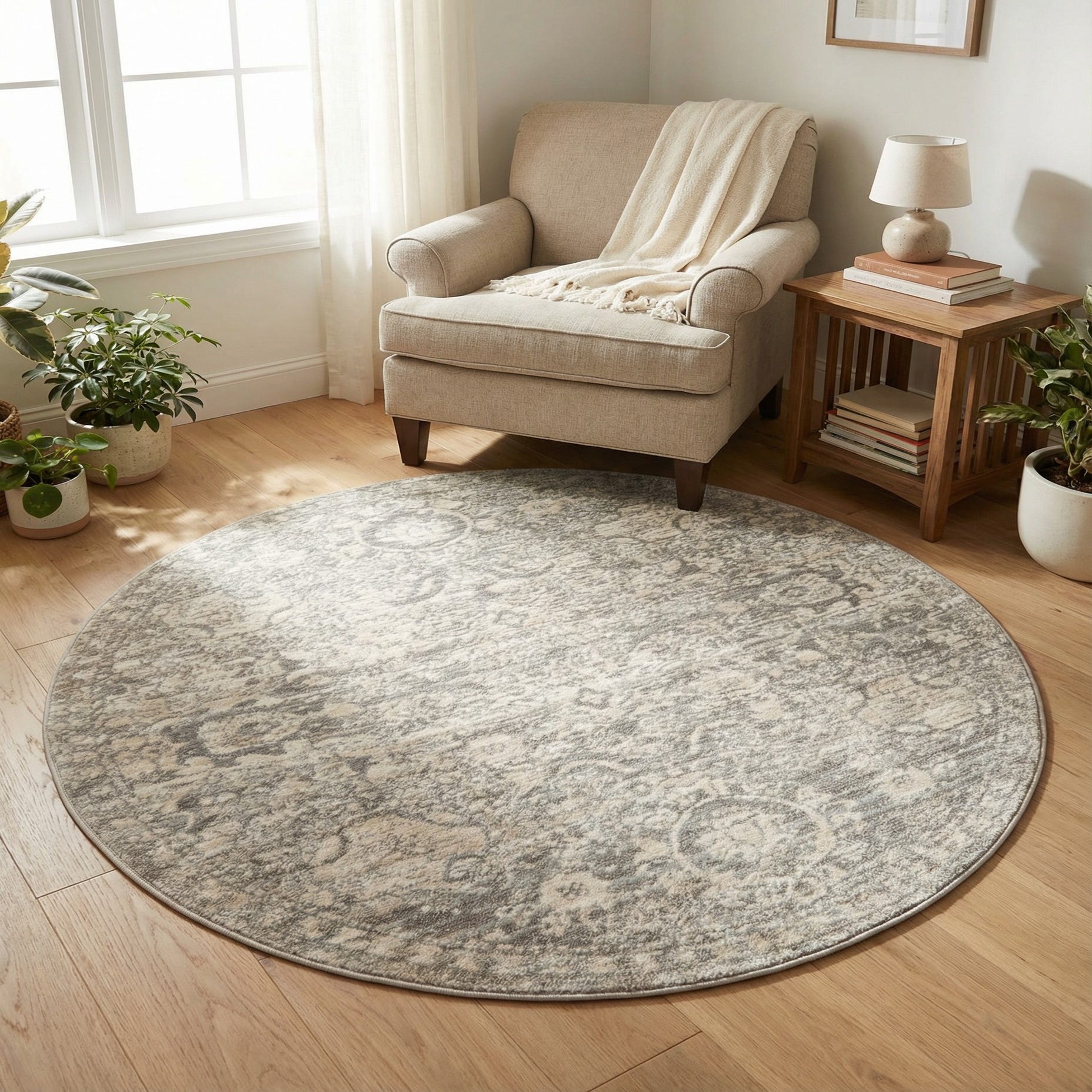 This round rug works well beneath a small dining table, in a cozy reading nook, or layered under an entry bench to define a space. Pair it with light wood furniture and natural linens for a relaxed, modern farmhouse vibe, or combine it with mid-century silhouettes and metal accents for a transitional setting that leans contemporary. The gray-and-ivory palette makes coordinating easy across warm and cool color schemes.