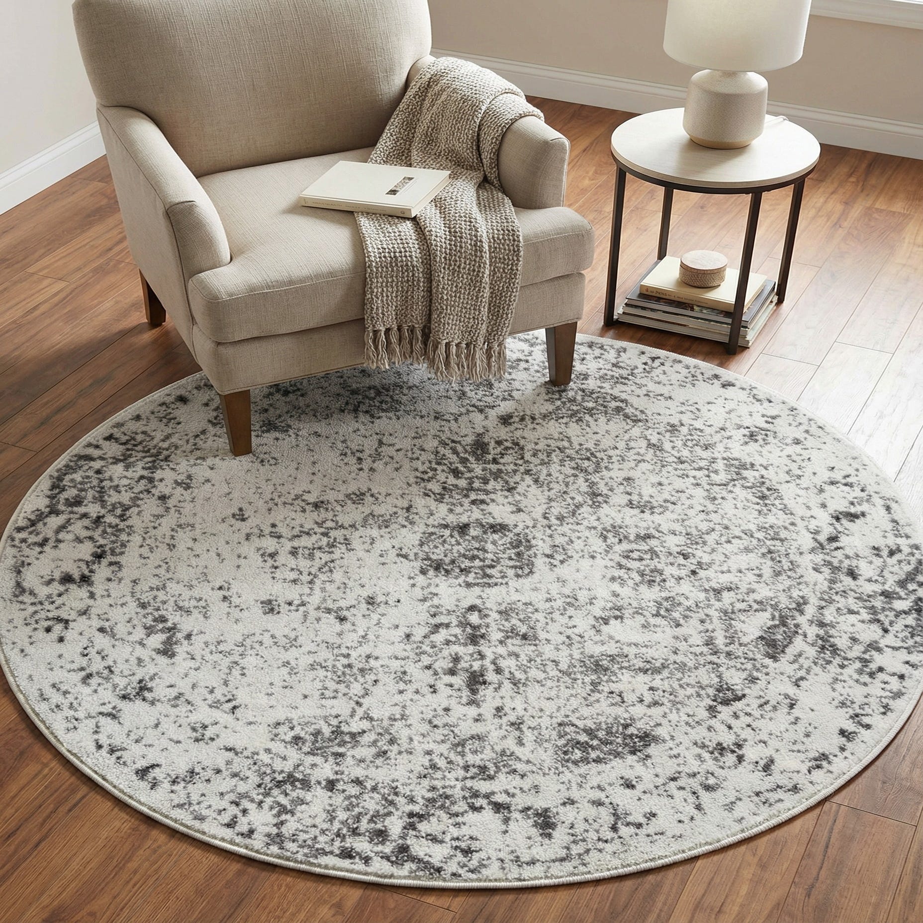 Machine-made from 100% polypropylene, the construction provides consistent texture and a flat profile that layers well in a variety of rooms. Place it beneath a small round dining table, anchor a cozy seating nook, or use it to warm up a bedside area—its neutral gray and beige palette pairs easily with modern, Scandinavian, or transitional interiors and complements both warm wood and cool metal finishes.