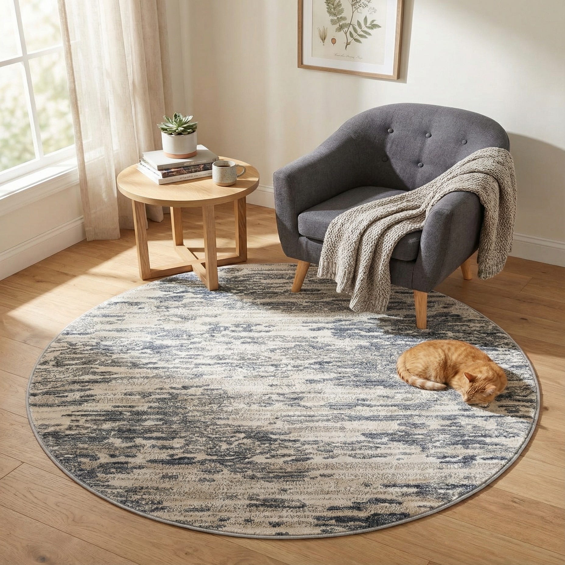 Ideal for transitional, coastal, or contemporary interiors, this round piece anchors seating groups, a cozy reading nook, or a breakfast area beneath a round table. Pair it with natural wood tones and linen upholstery for a relaxed palette, use navy accents and brass or matte-black hardware for a more tailored look, or place it in a bedroom to soften hardwood floors and frame bedside furniture.