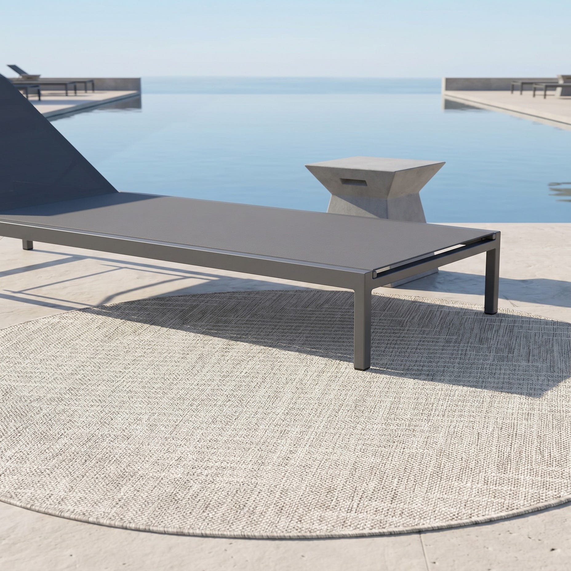 Love the contemporary look of this rug! We are so happy we chose this to accent the blue of our pool with our living area on our lanai. We still are going to add a few more pillows but love the rug to add color.