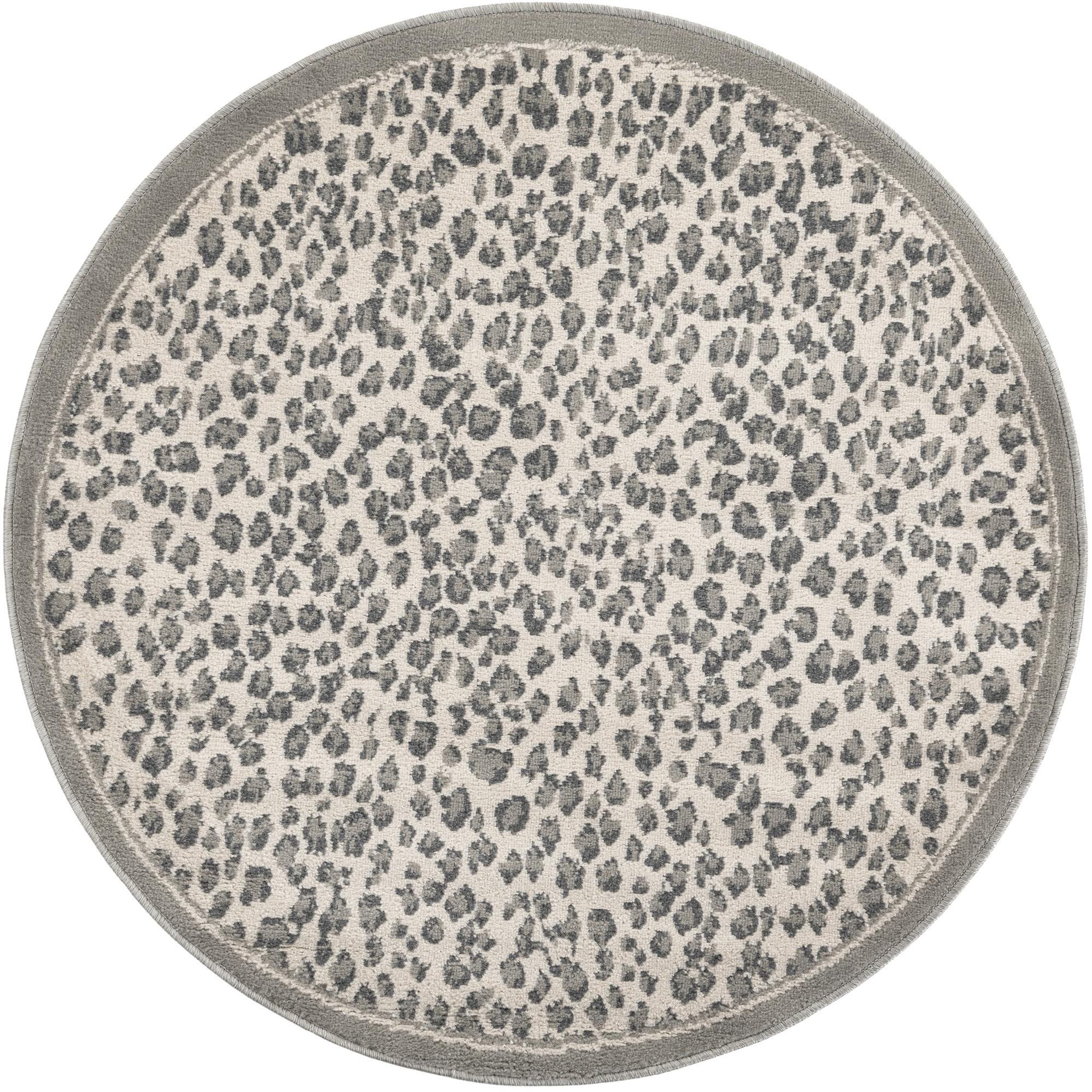 A round 4' gray and silver modern rug with a subtle leopard print pattern and a solid gray border.