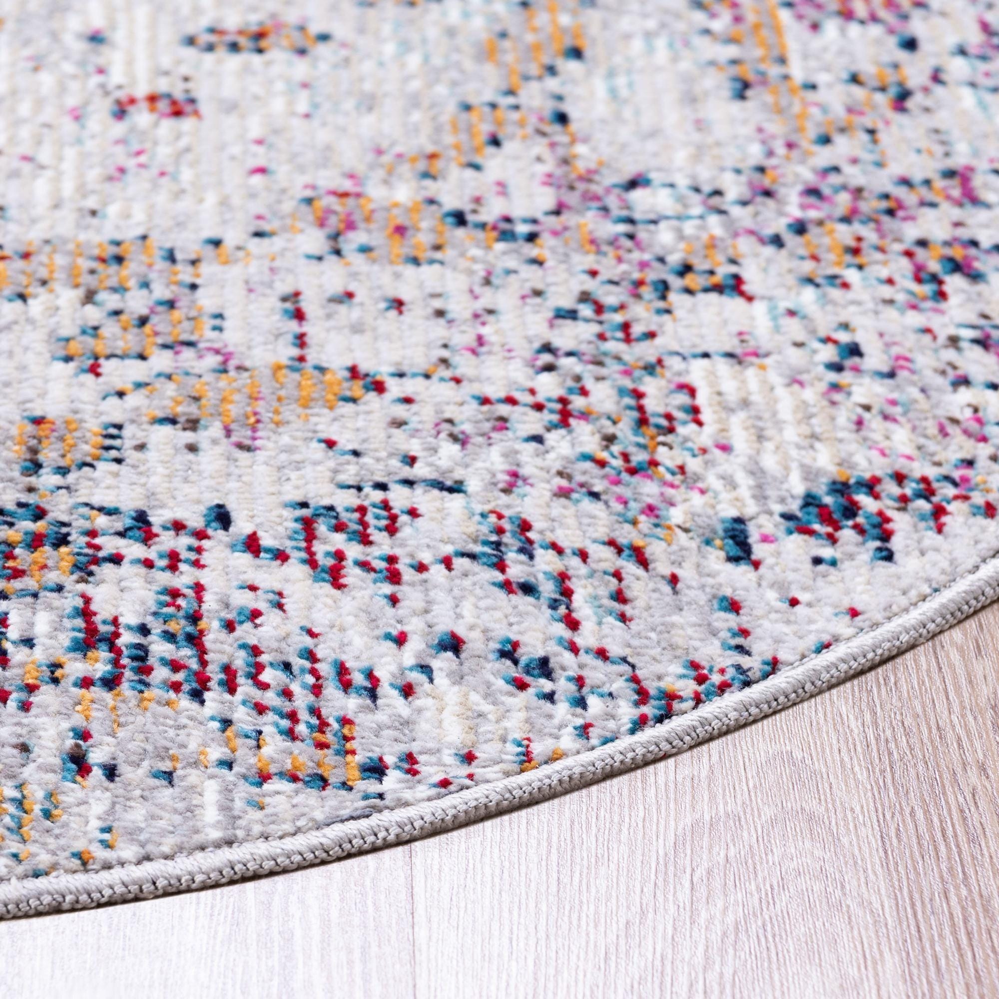 A 4' round gray rug with an abstract, distressed pattern in shades of red, orange, and blue.