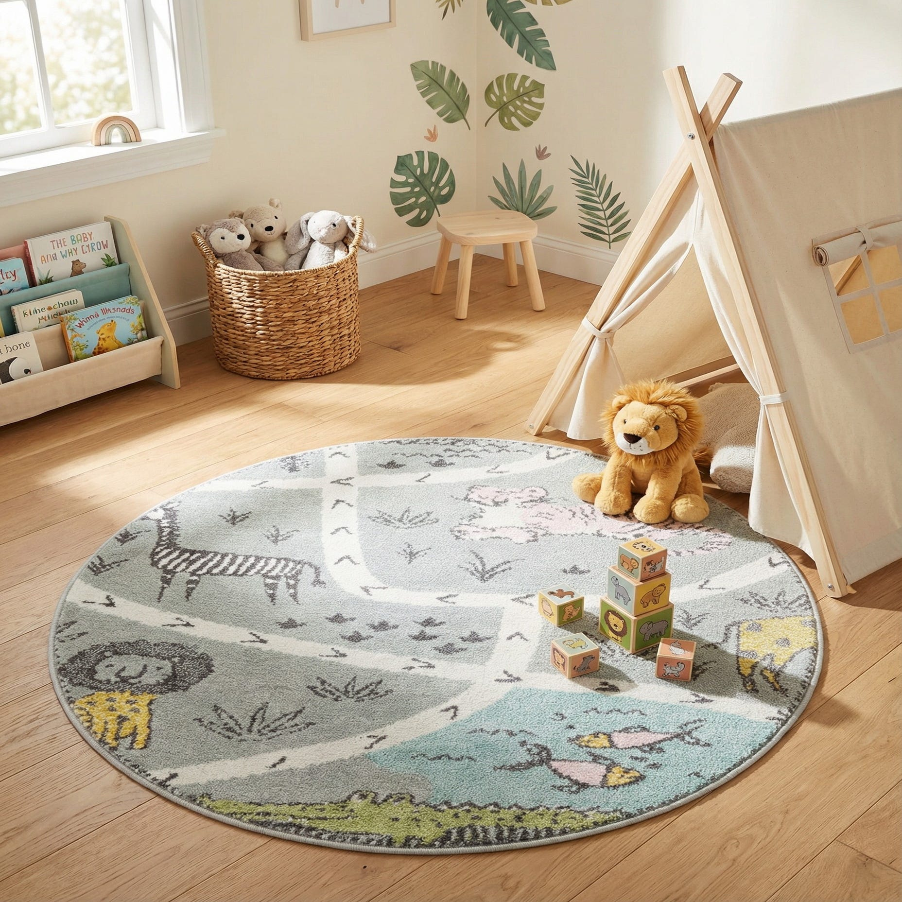 This round rug works well as the anchor for a nursery reading corner, a playroom activity area, or a child’s bedroom layered under a small table and chairs. Pair it with soft pastels and natural wood furniture for a Scandinavian-inspired look, or add bright pillows and storage bins for an energetic play space. Its neutral gray background makes it easy to coordinate with both subtle and colorful décor schemes.