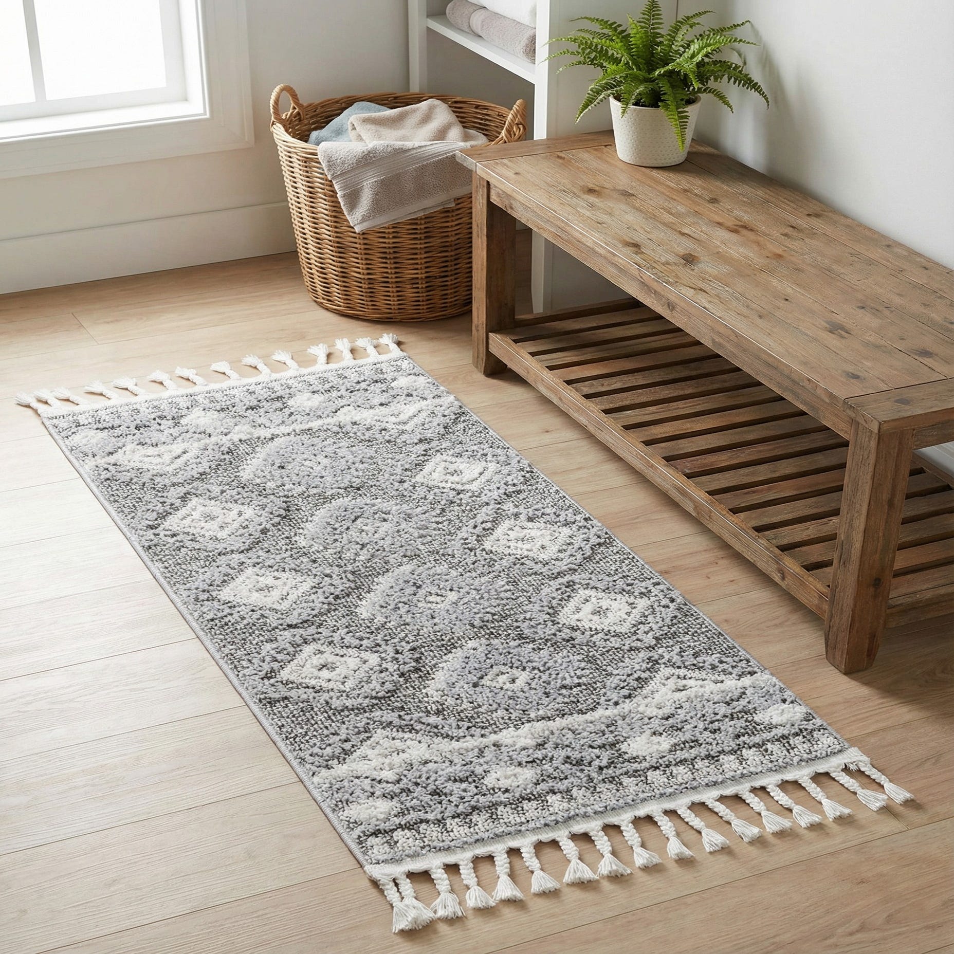 This Boho collection 4 ft runner, machine woven from 100% polyester, is a versatile addition to any home. Its gray and ivory color palette offers a neutral foundation that complements a range of interior styles, while the distinctive pattern injects a touch of bohemian charm. The rug features a flatweave construction, known for its durability and ease of maintenance.
