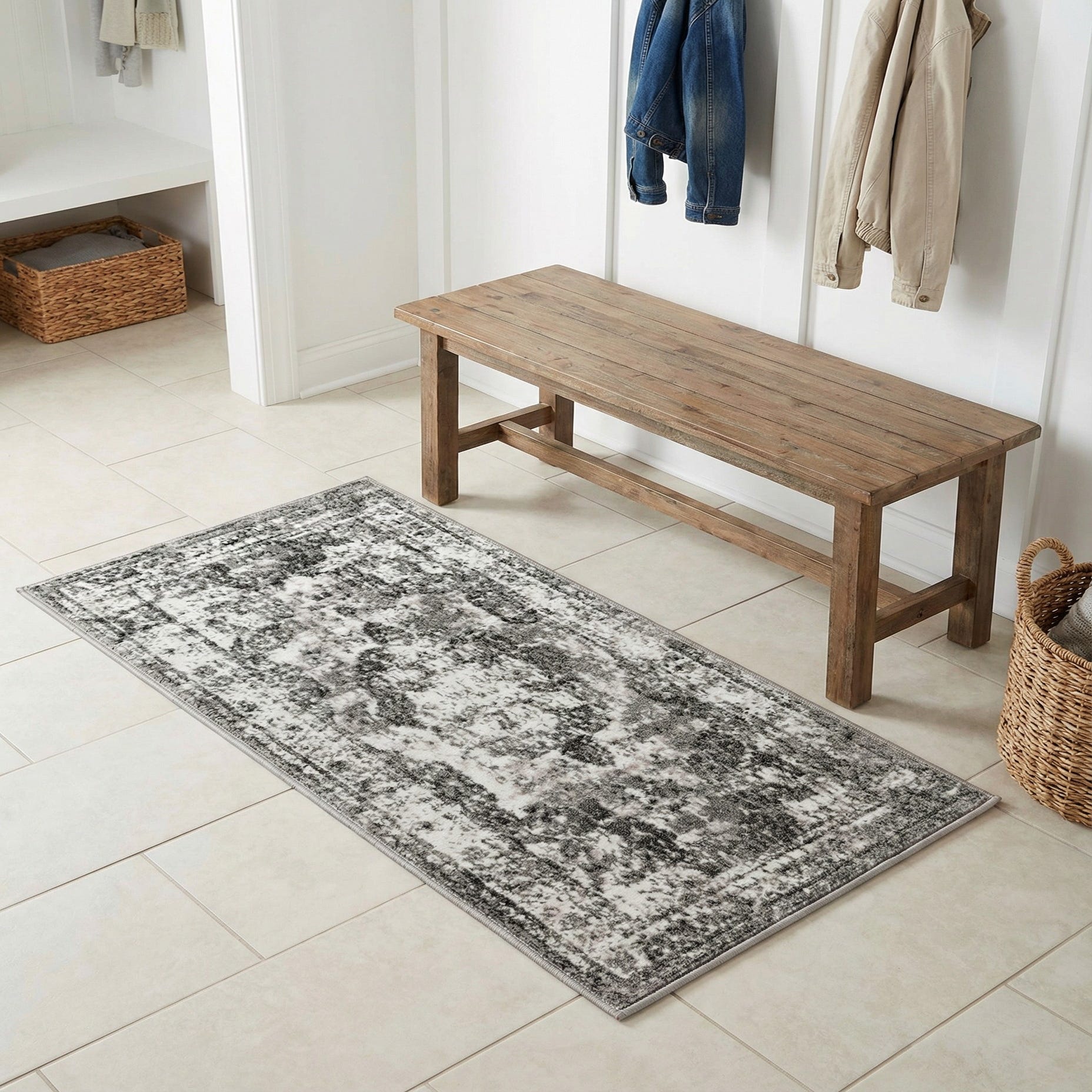 This runner works well in narrow, transitional spaces where you want a restrained, vintage-inspired touch. Place it in an entry hall or corridor to anchor a sequence of rooms, or layer it in front of a kitchen sink or along a sideboard to add softness underfoot. It pairs naturally with warm wood tones, matte metals, and neutral upholstery—think modern farmhouse, contemporary transitional, or minimalist Scandinavian interiors that benefit from a quiet, textured element.