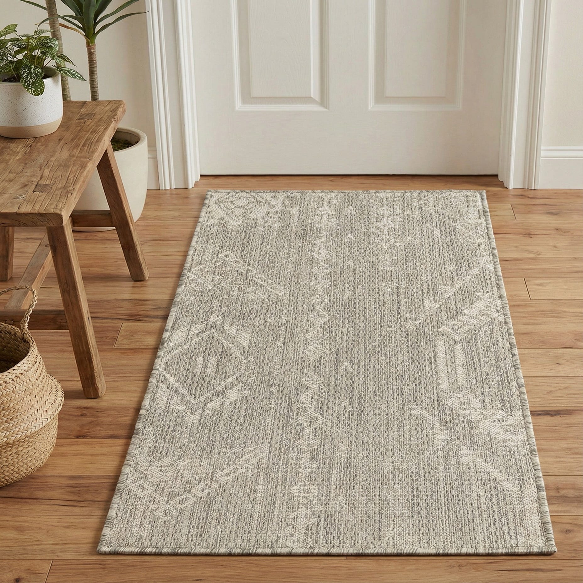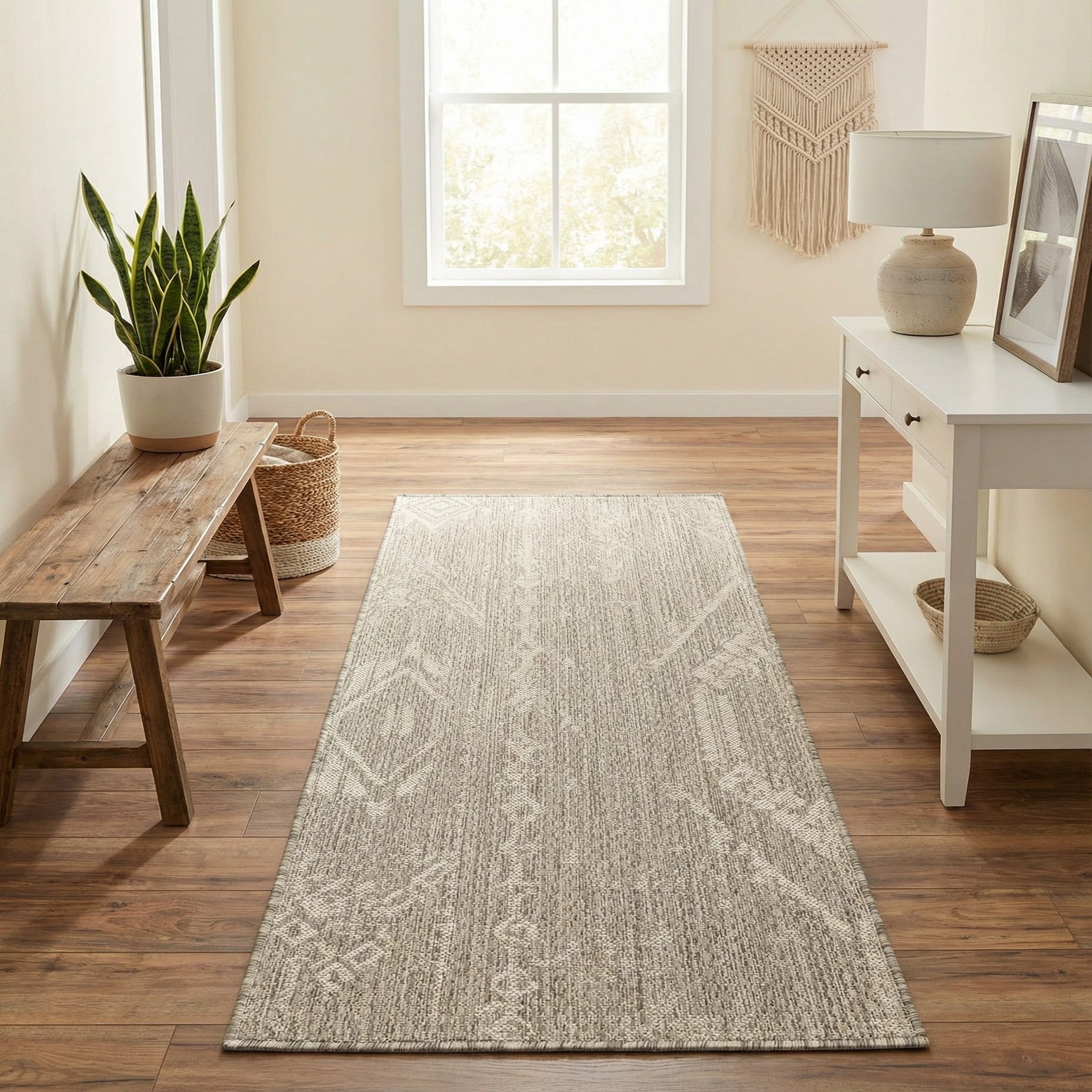 Well-suited for outdoor settings due to its material and stain-resistant qualities, this runner can effortlessly accentuate balconies, patios, or entryways. The pet-friendly and shed-free nature of the rug also makes it an excellent selection for high-traffic indoor areas such as hallways or kitchens, where practicality is as paramount as style. The subdued color palette allows for seamless integration with both contemporary and traditional interiors, serving as a grounding element that complements a variety of furniture and accent pieces.