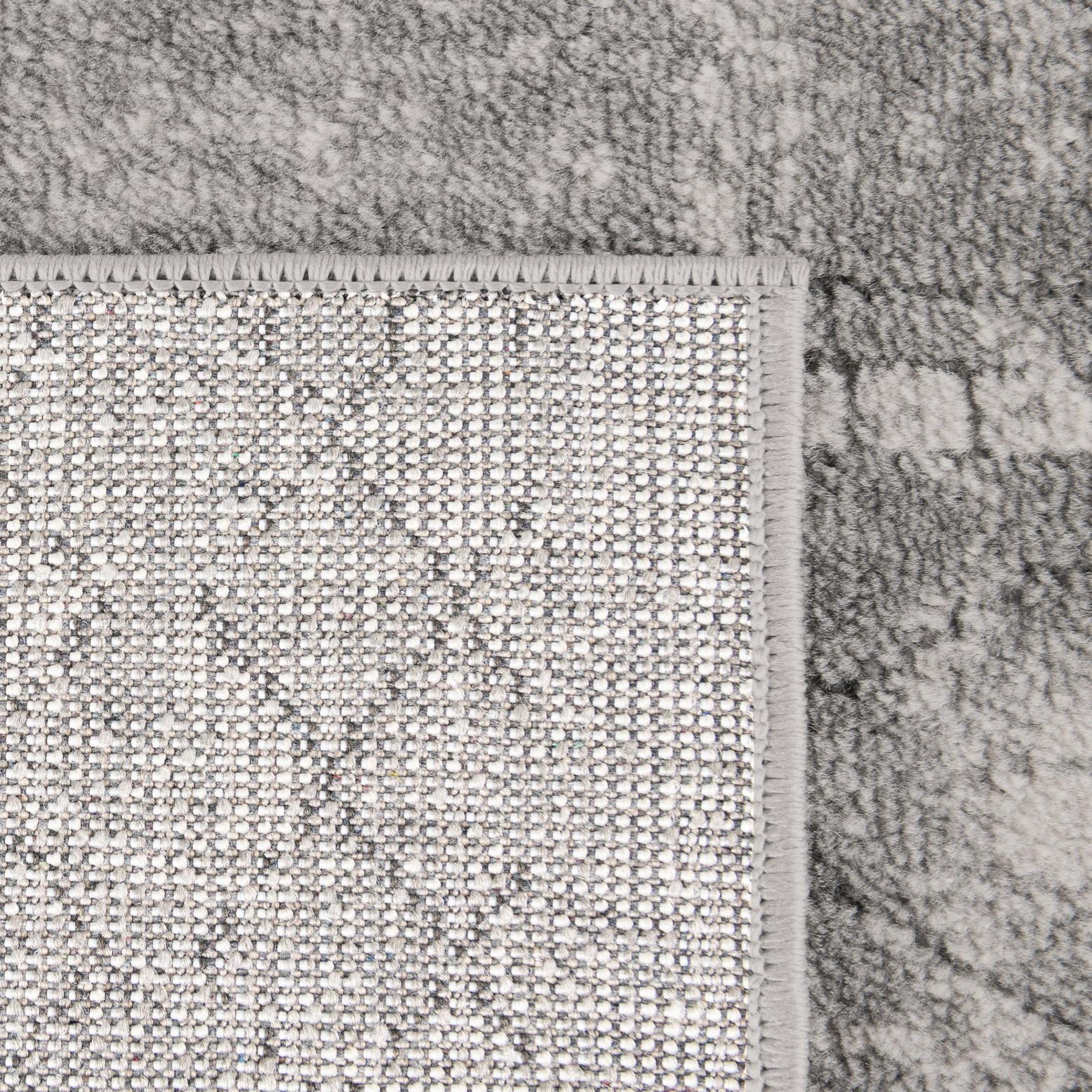 A softly weathered pattern gives this rug a lived-in look, with vertical bands and faded medallion motifs woven across a gray background. Cream and beige highlights sit gently against the gray field, creating subtle contrast and layered depth without sharp edges. The surface has a low-to-medium pile with a slight high-low texture you can feel beneath your fingers — a soft polyester touch over a stable polypropylene body that adds visual interest and a muted, refined sheen.