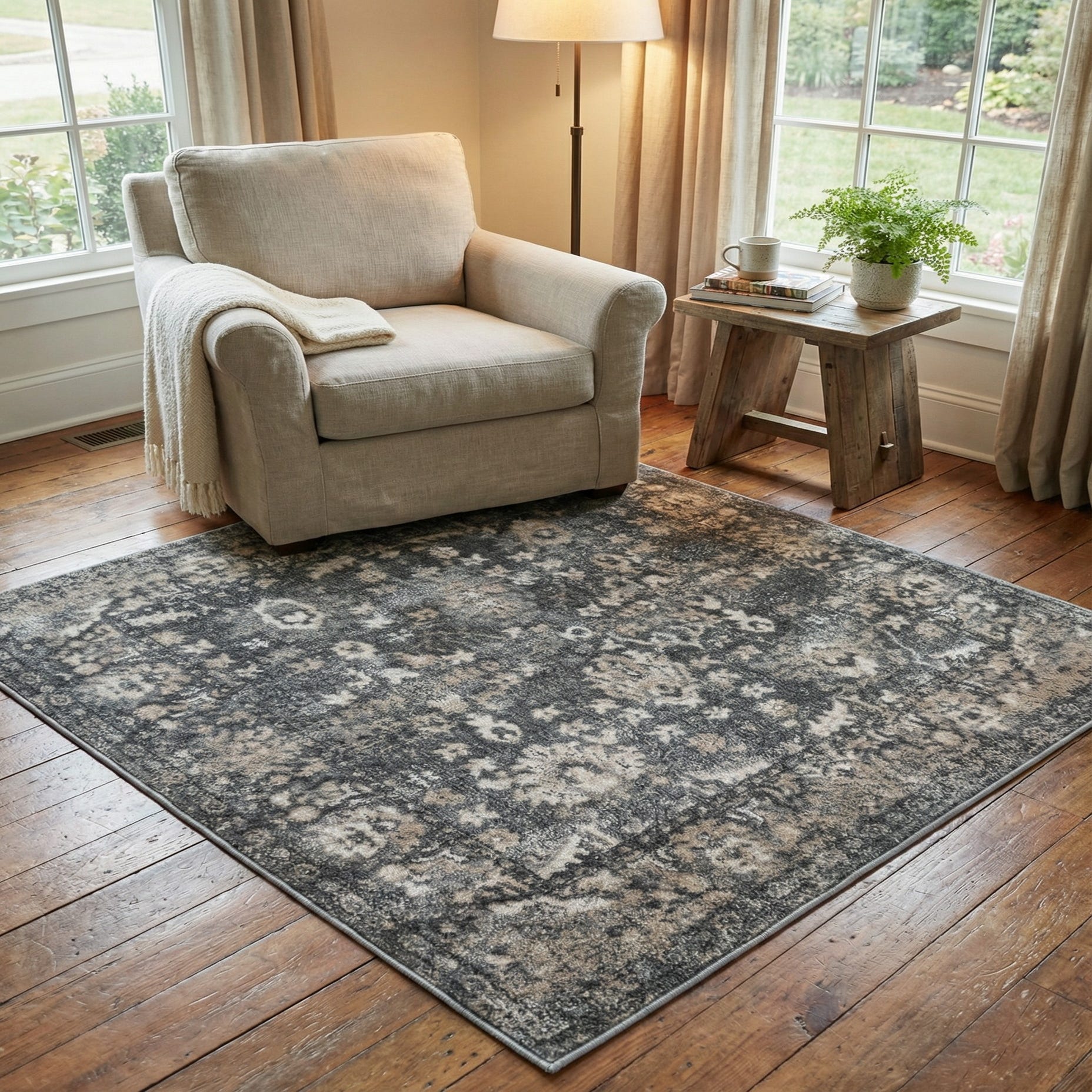 A timeworn, traditional pattern lays across a gray background, where faded medallion and floral motifs in beige and ivory create a softly aged look. The design balances ornamental detail and open space, with a worn-edge border that gently frames the field. Color contrast is subtle rather than stark—ivory highlights and warm beige accents lift the deeper gray field for a layered, vintage-inspired appearance that suits both classic and modern interiors.
