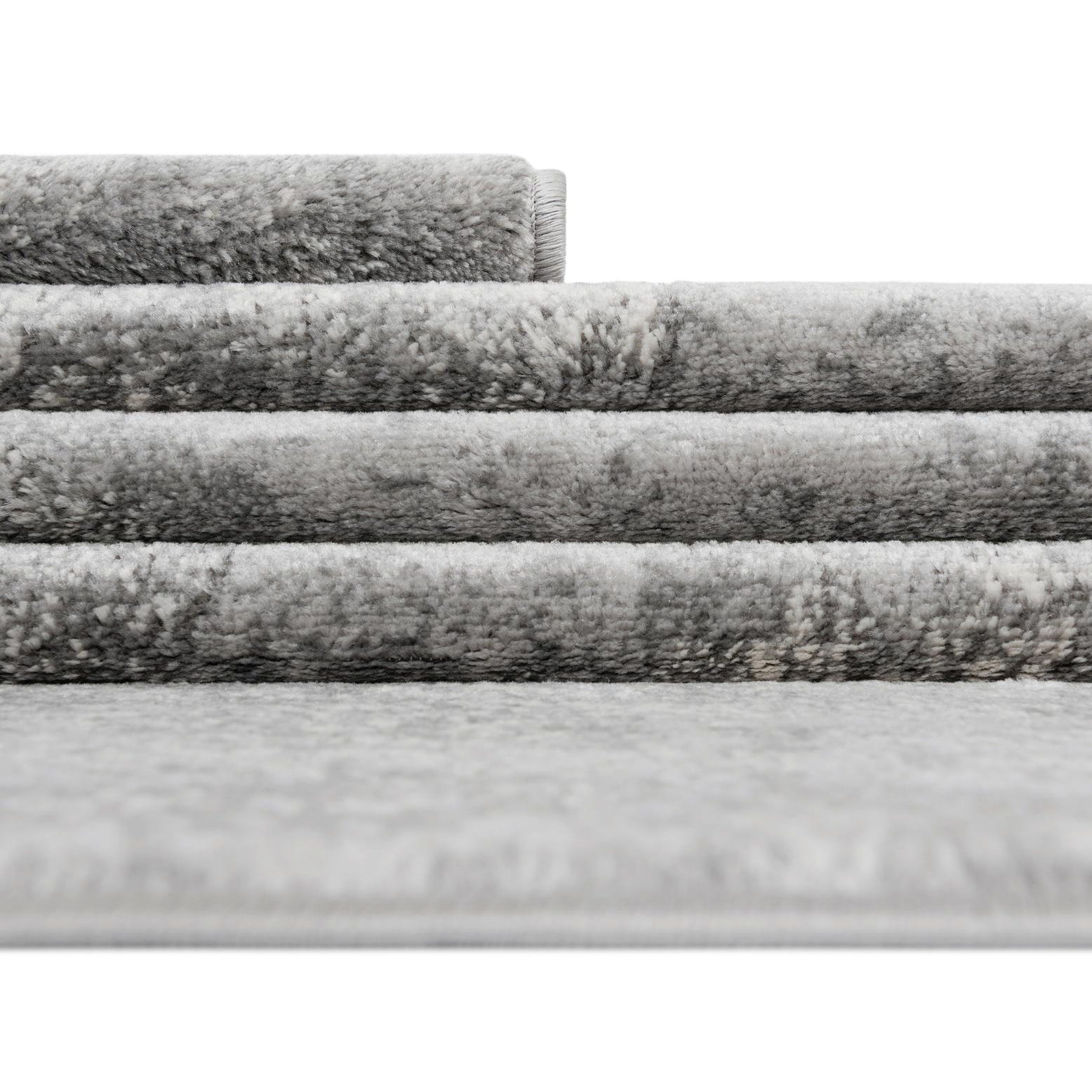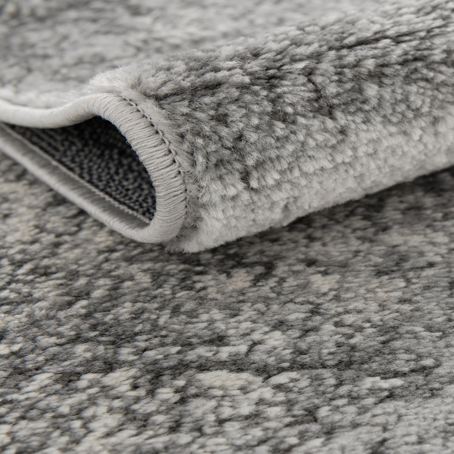 A soft gray field with whispering ivory highlights creates a low-contrast, mottled effect that reads as modern and understated. The design is essentially solid with subtle, abstract variation across the surface — an uncomplicated look that adds depth without drawing attention away from your furnishings. Machine made from 85% polypropylene and 15% polyester, the pile feels plush to the hand with a slight sheen from the polyester fibers, giving the rug a tactile, velvety feel underfoot and a consistent finish across the surface.