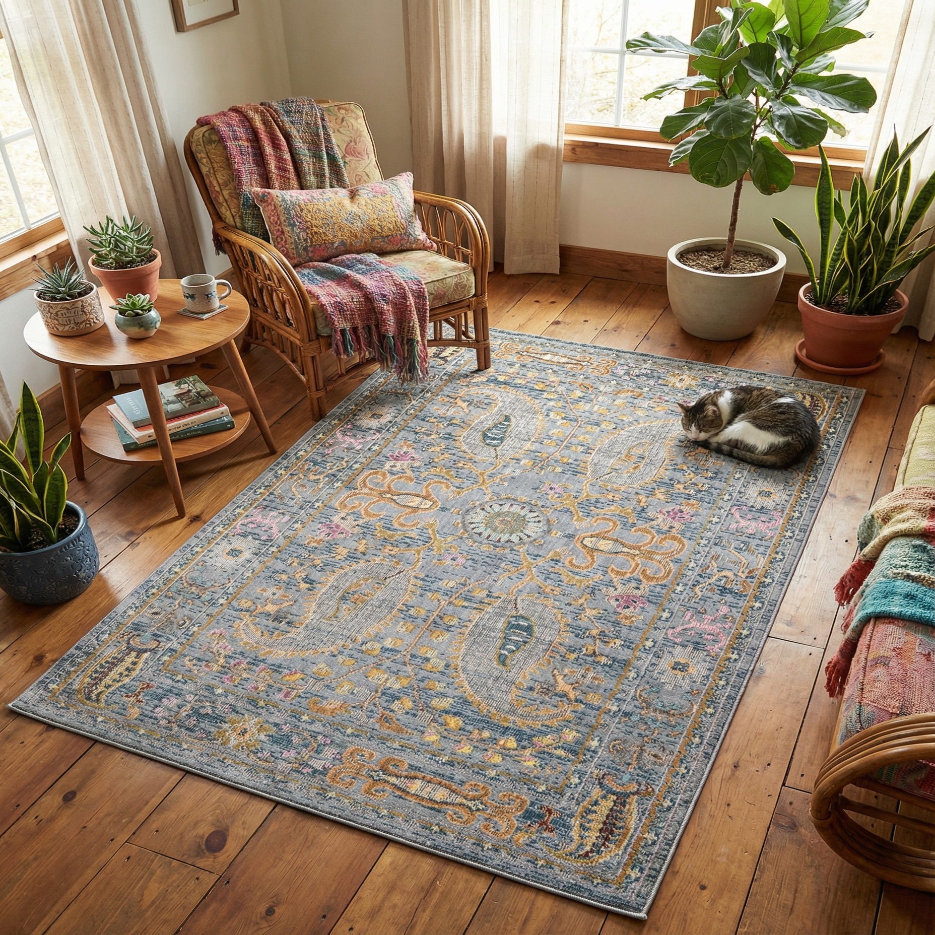 Primary color is Gray. Colors in this rug include: Gray, Blue, Light Blue, Navy Blue, Beige, Yellow, Pink, Burgundy.