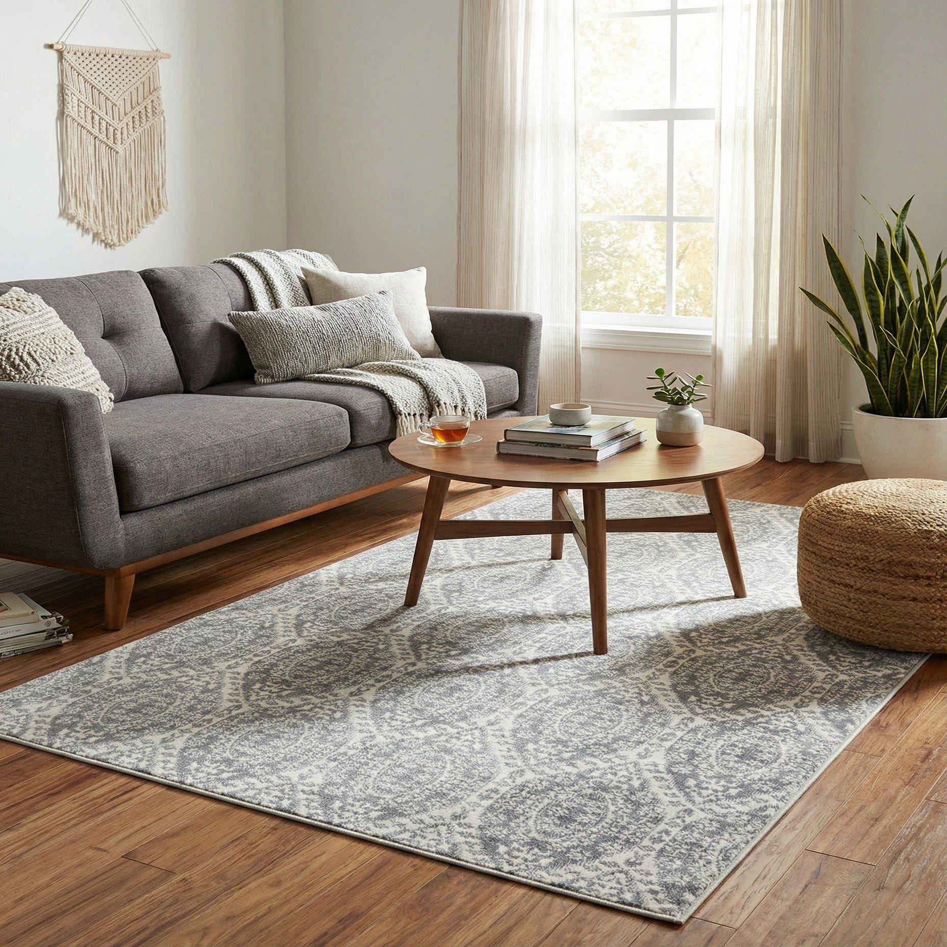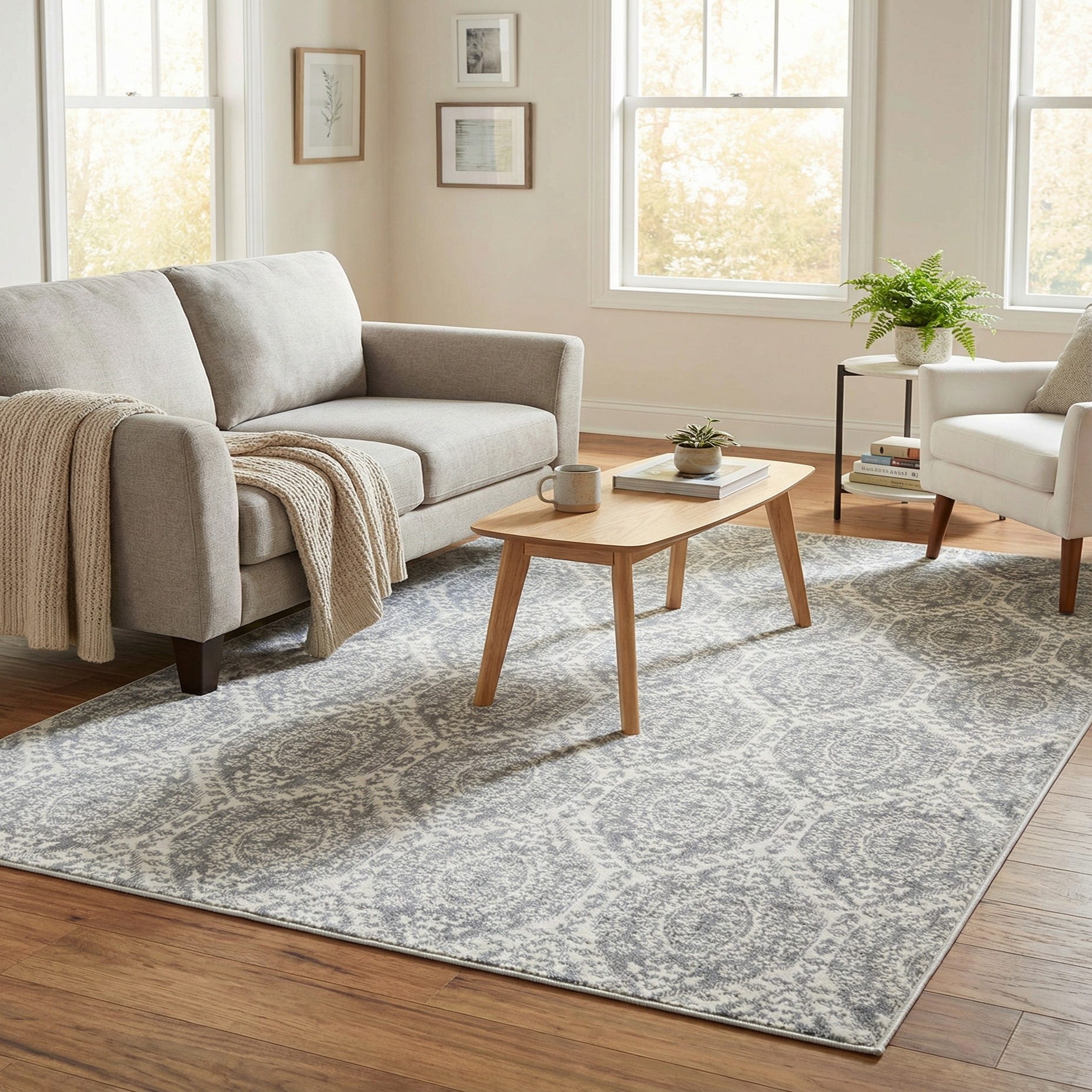 This rug works well in living rooms beneath a coffee table, in bedrooms layered under a bed, or in a home office to anchor seating. Its neutral gray-and-ivory palette blends with modern, transitional, Scandinavian, and farmhouse schemes; pair it with pale woods and linen upholstery for a relaxed feel, or with charcoal accents and brushed metal for a more contemporary look.