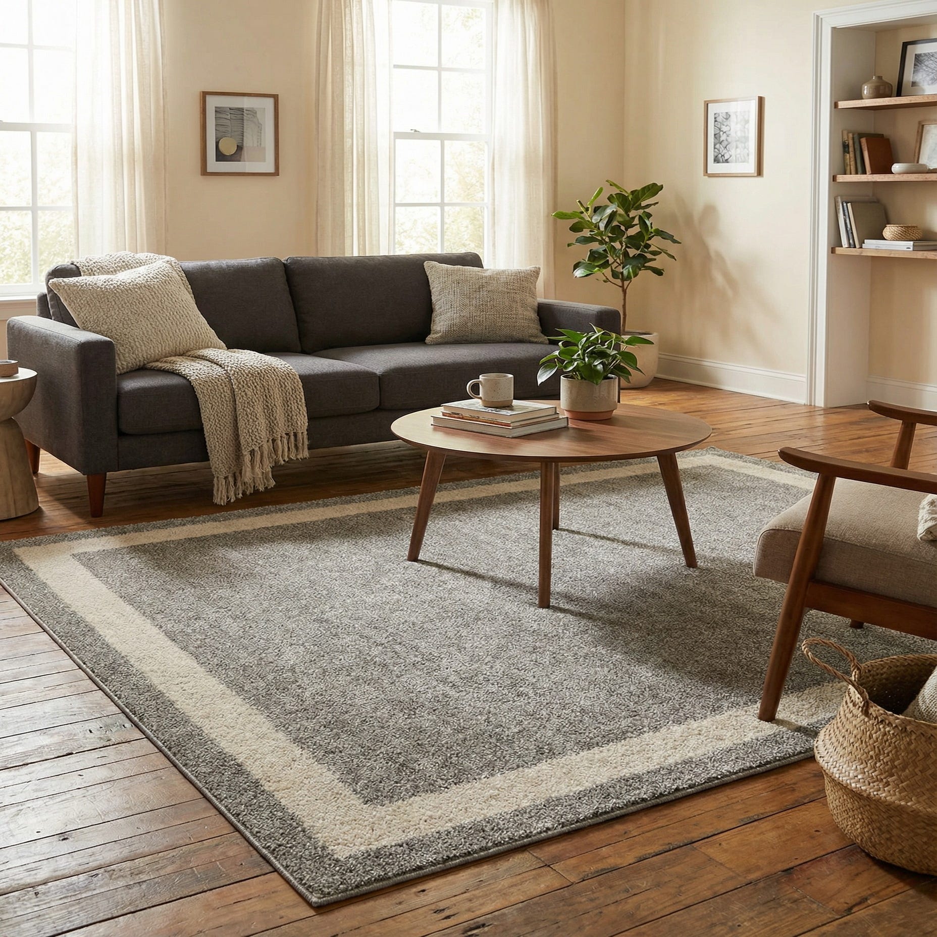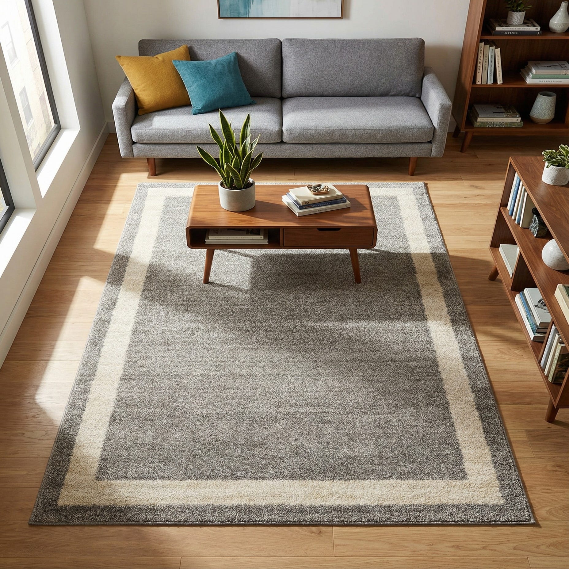 A clean, contemporary bordered rug in a soft gray field with a crisp ivory inner band. The simple rectangular frame gives the design a tailored, architectural feel while the subtly variegated gray pile adds visual depth without busy patterning. Machine-made from 100% polypropylene, the low-profile pile has a smooth, slightly plush hand that lays flat and invites bare feet.