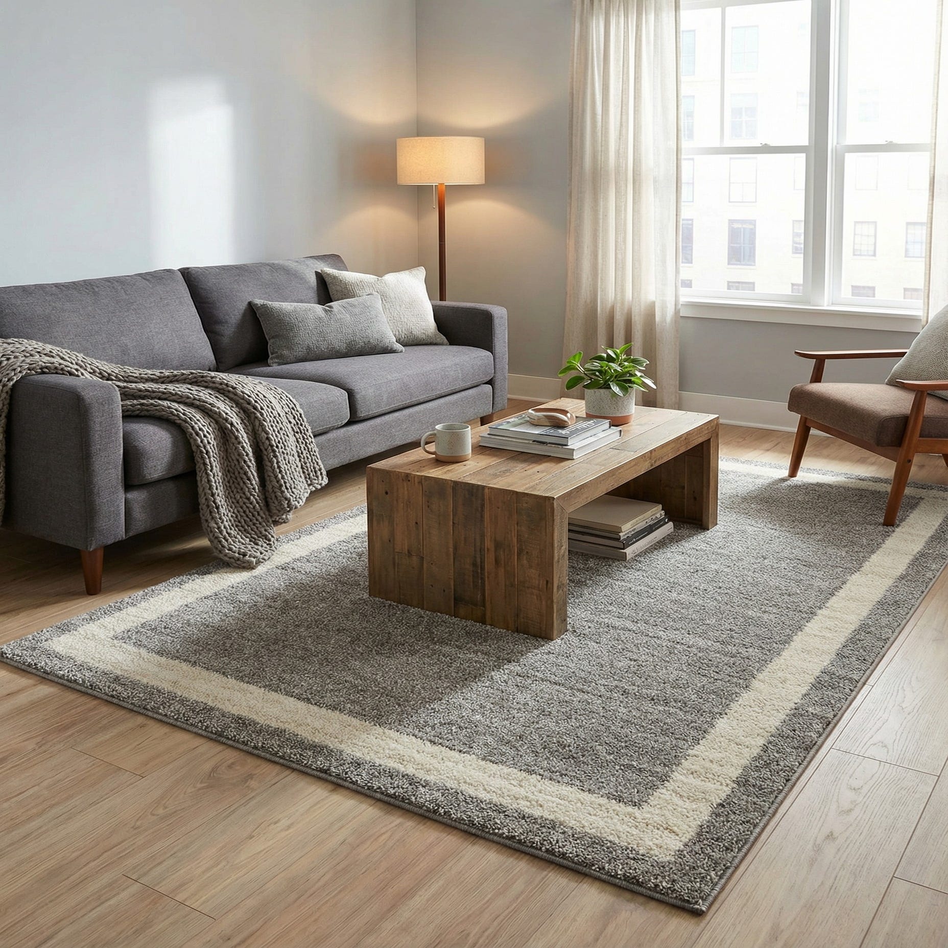 A rectangular 4x6 gray area rug with a subtle cream border, suitable for a modern living room.