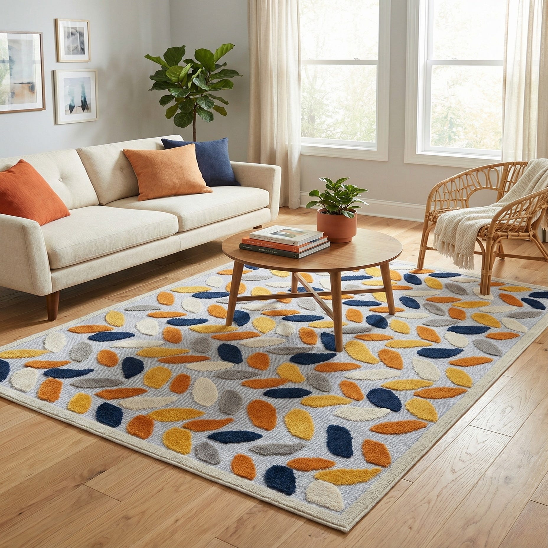 A 4x6 rectangular indoor/outdoor rug with a gray background and a modern trellis pattern of textured, leaf-like shapes in orange, yellow, navy, gray, and cream.
