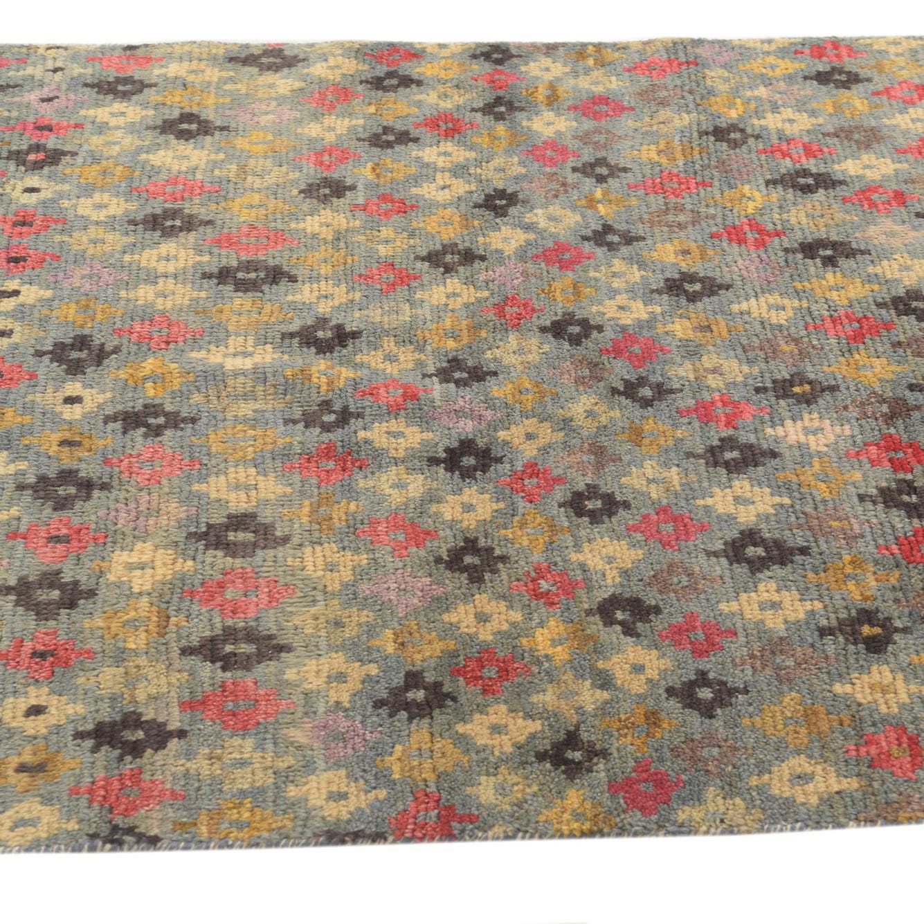 Primary color is Gray. Colors in this rug include: Gray, Brown, Burgundy, Gold, Ivory, Red, Olive.