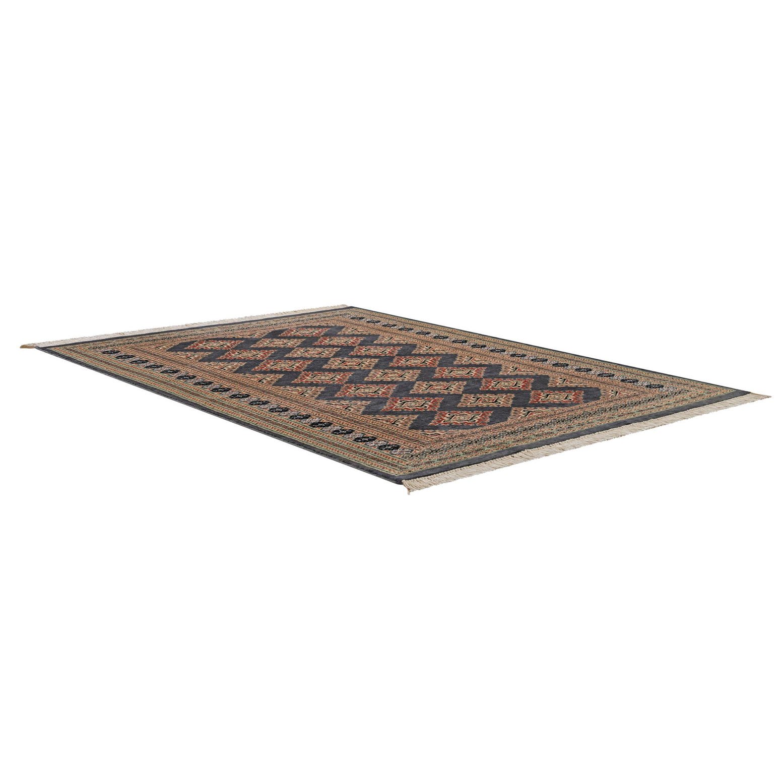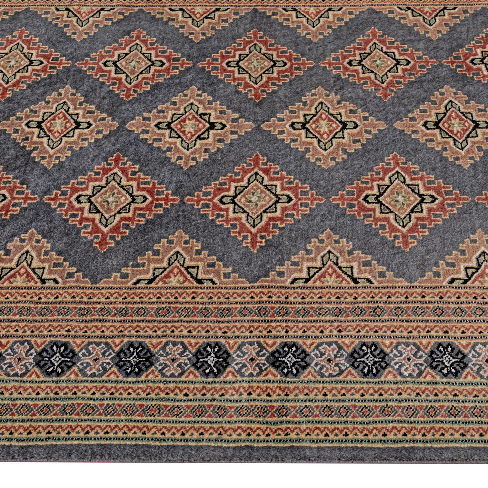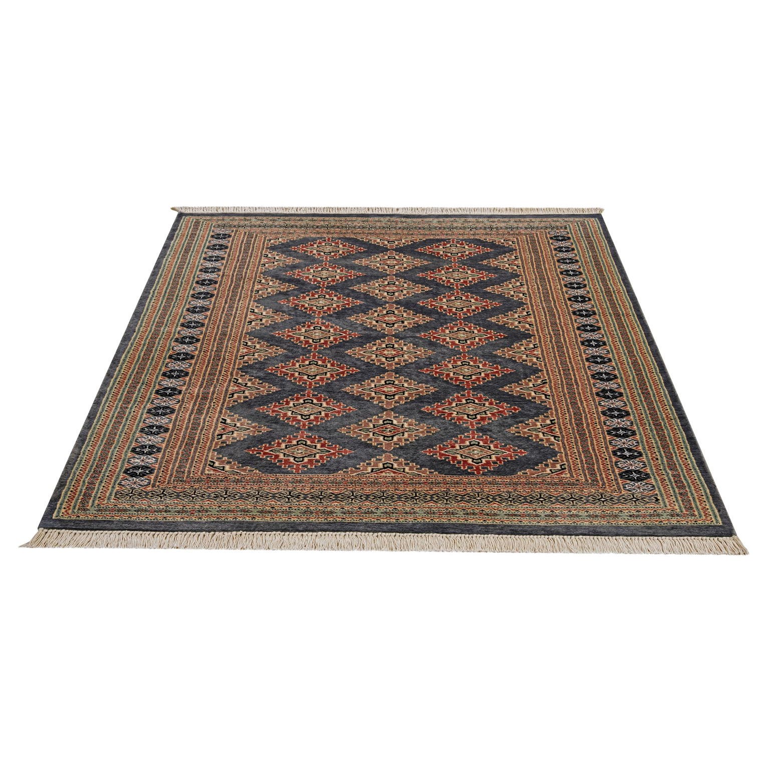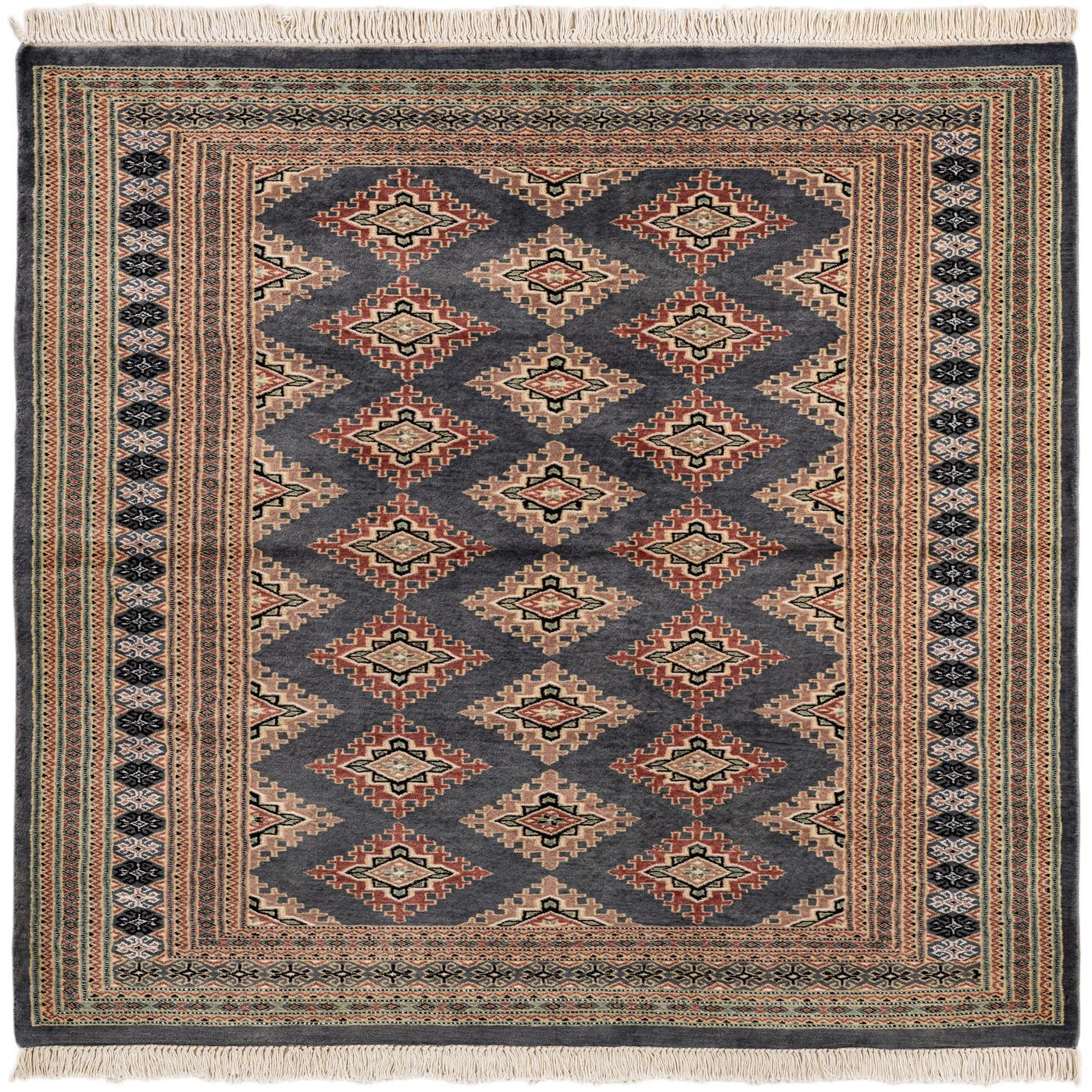 A 4x6 rectangular gray tribal rug with a traditional Bokhara pattern and intricate borders, suitable for a living room.