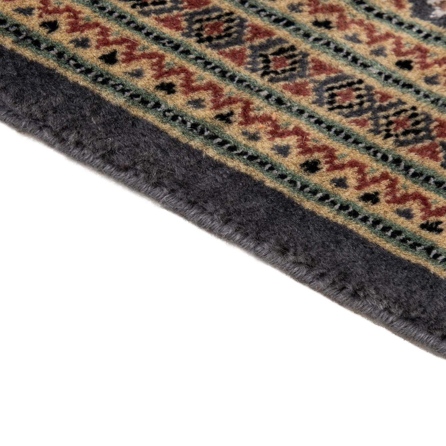 Primary color is Gray. Colors in this rug include: Gray, Beige, Black, Blue, Brown, Ivory, Navy Blue, Rust Red.