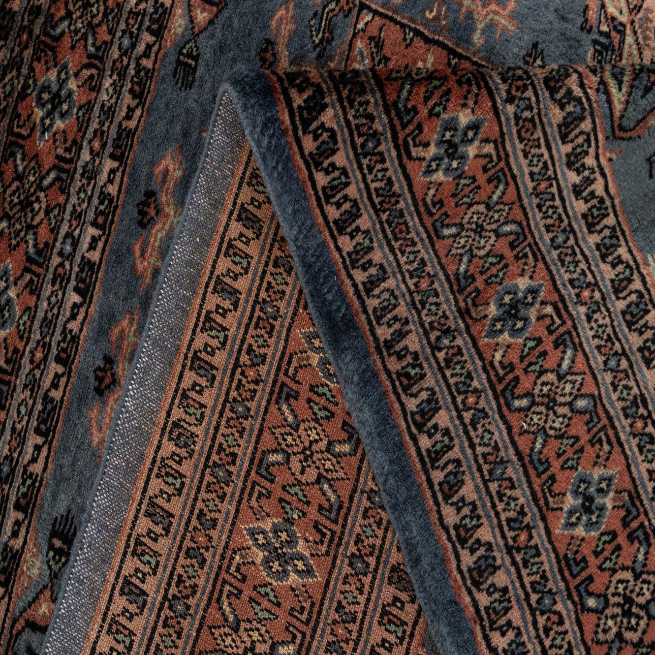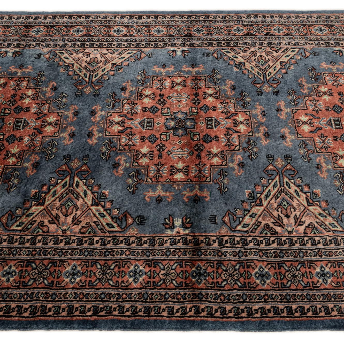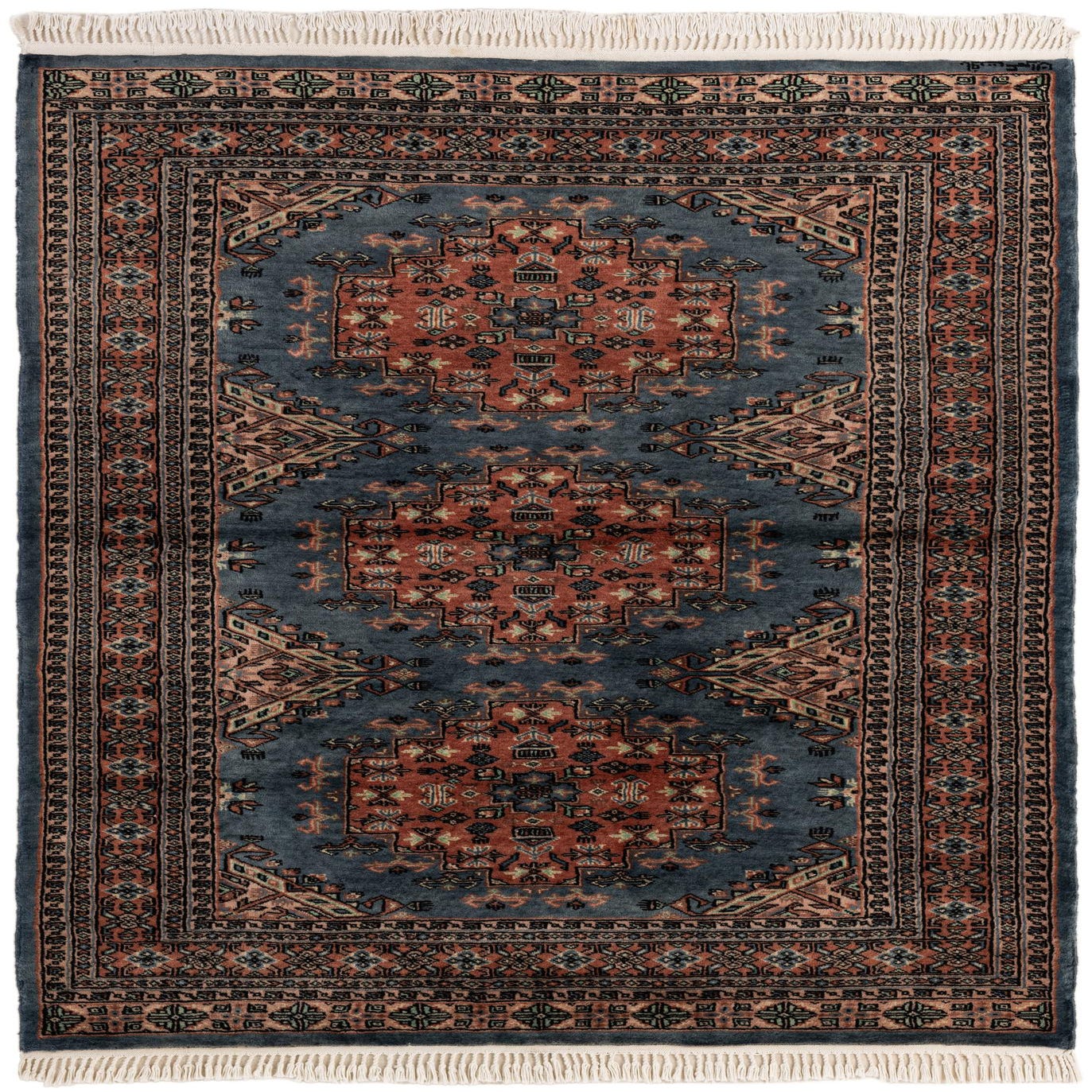 A classic Bokhara-inspired pattern arranges three geometric medallions down a soft gray field, framed by layered guard borders rich with miniature motifs. Warm terracotta-pink central motifs are tempered by beige, brown and black accents, with ivory highlights and fine detailing throughout the border. Hand-knotted from 100% wool, the pile has a dense, tactile feel that offers subtle sheen and a comfortable underfoot presence; the knotted fringe at the ends adds a traditional finishing touch.