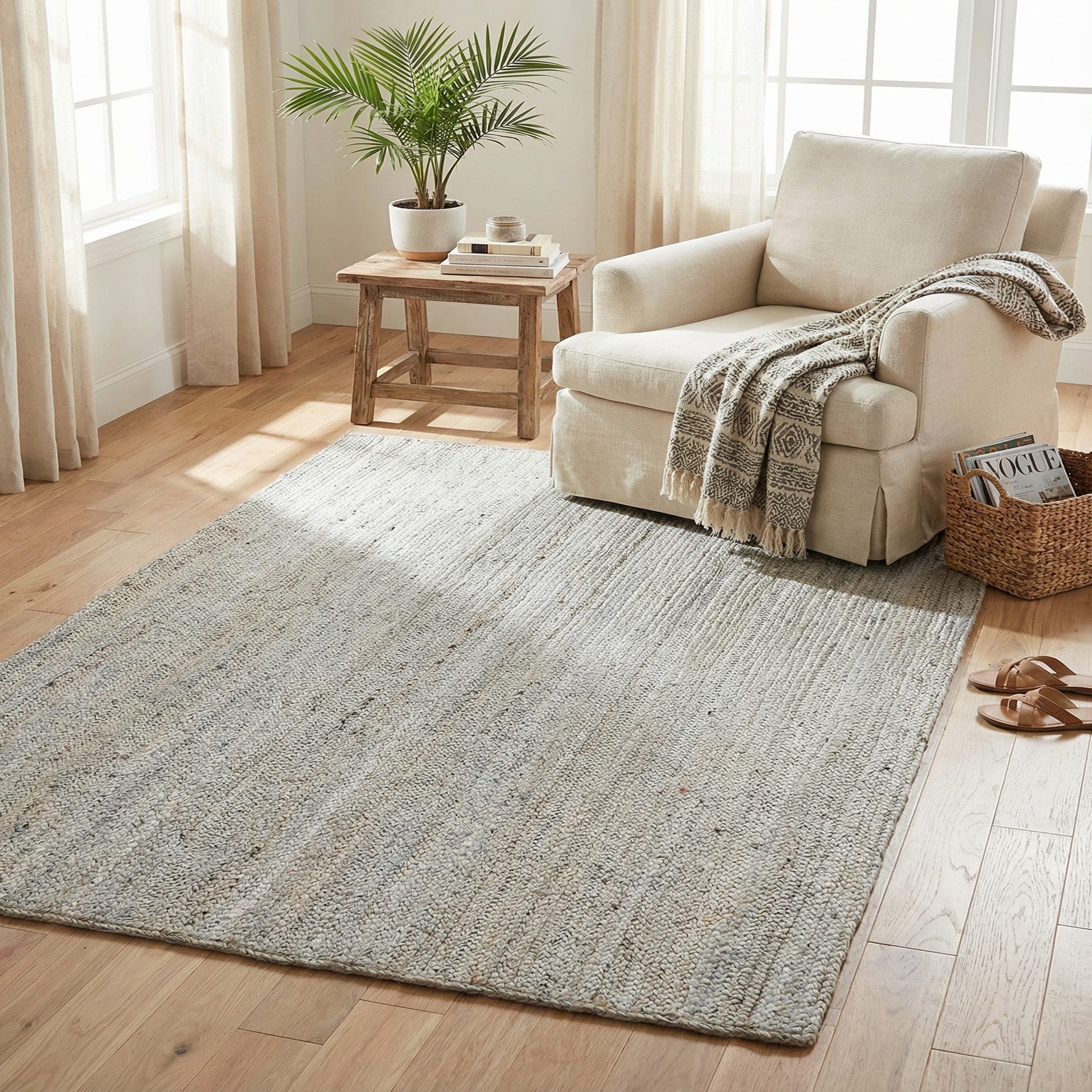 A 4x6 rectangular gray braided jute rug with a textured, minimalist flatweave design, perfect for a living room.