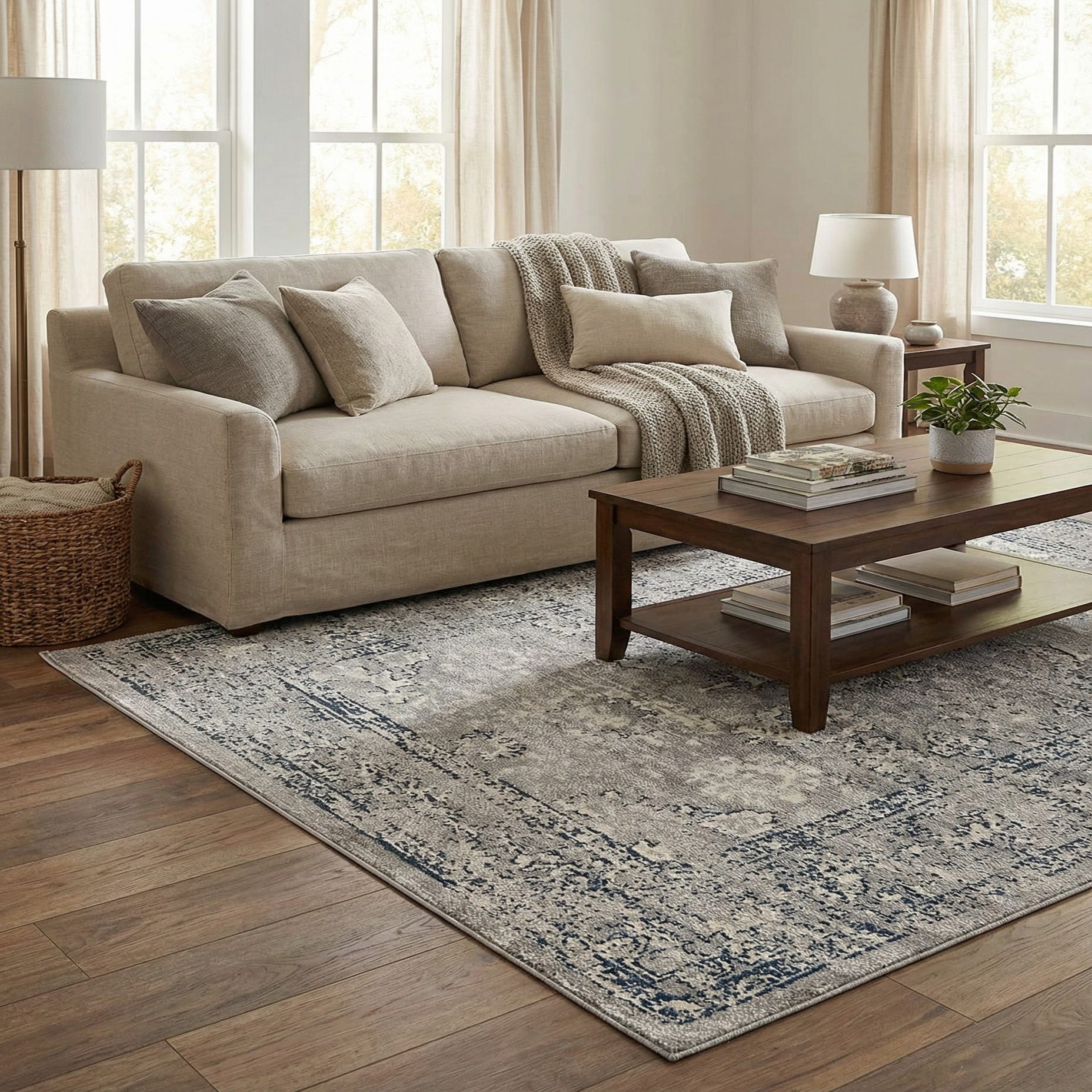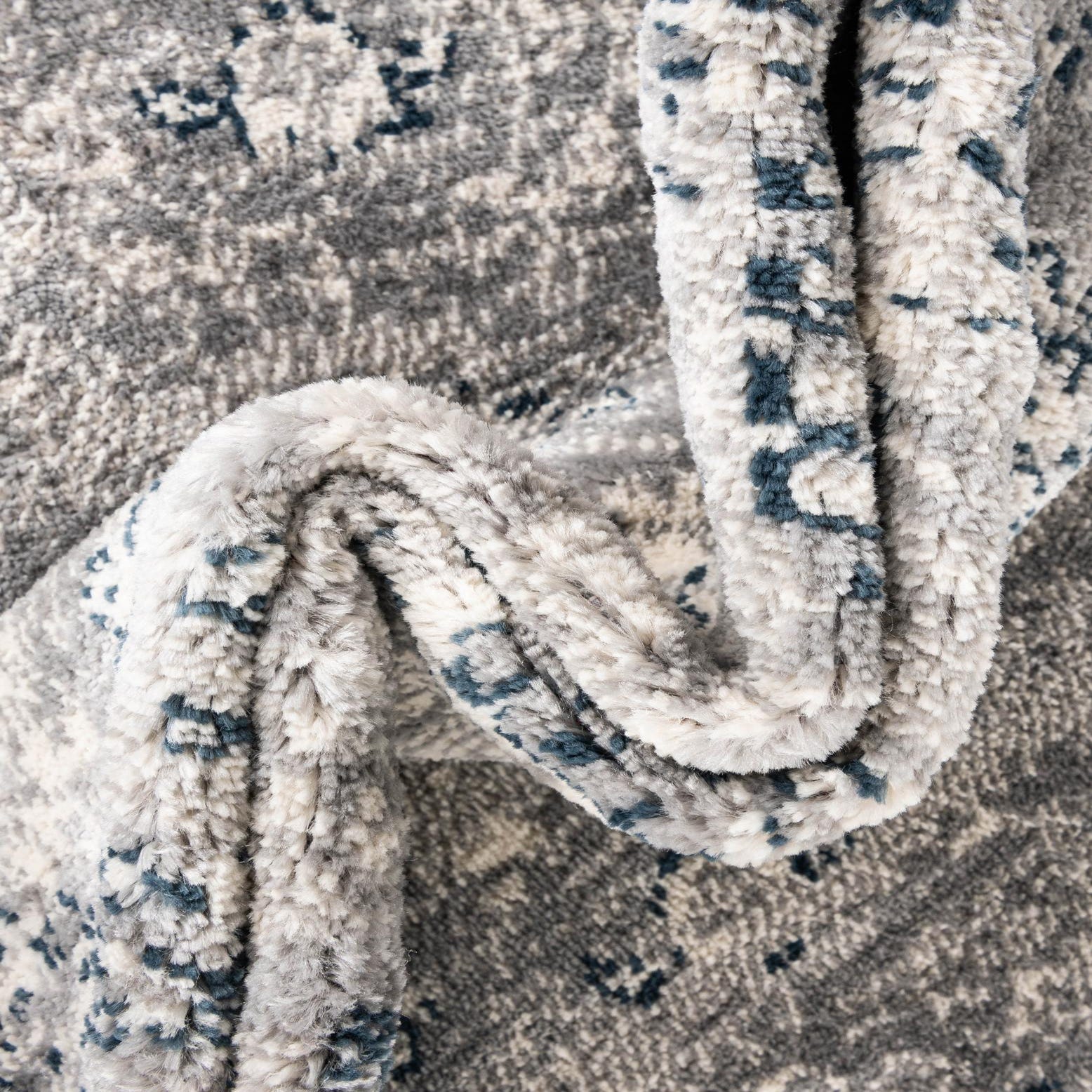 A cool gray ground anchors a softly distressed, traditional medallion pattern in ivory with navy blue accents. The worn border motifs and faded central medallion create a vintage-inspired, lived-in look that adds visual interest without overwhelming the room. The muted navy highlights bring depth to the neutral palette, while the ivory detailing lifts the design for a balanced, calming effect.