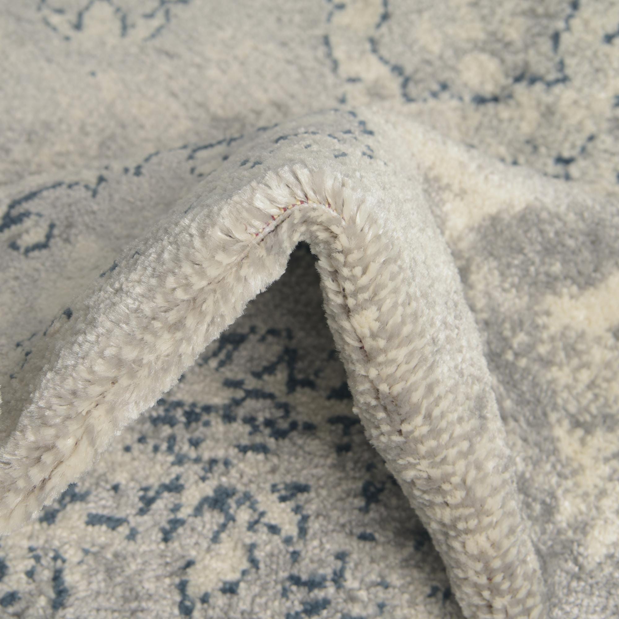 Primary color is Gray. Colors in this rug include: Gray, Ivory, Navy Blue.
