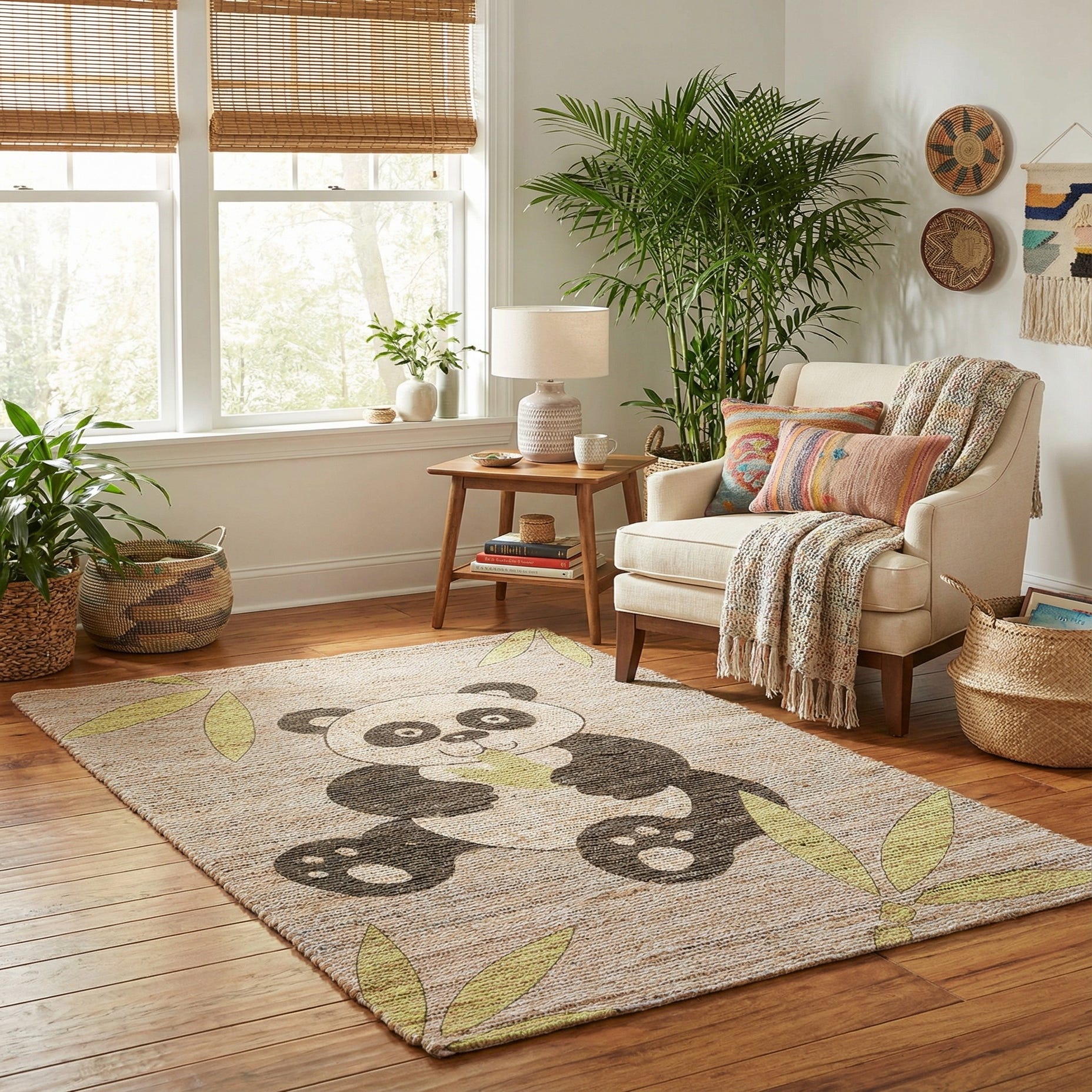 A rectangular 4x6 gray and black chenille and jute rug featuring a cute panda holding bamboo, surrounded by green bamboo leaves.
