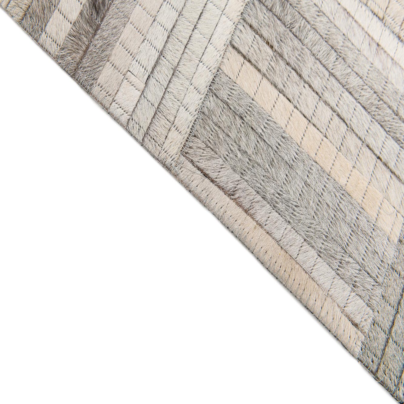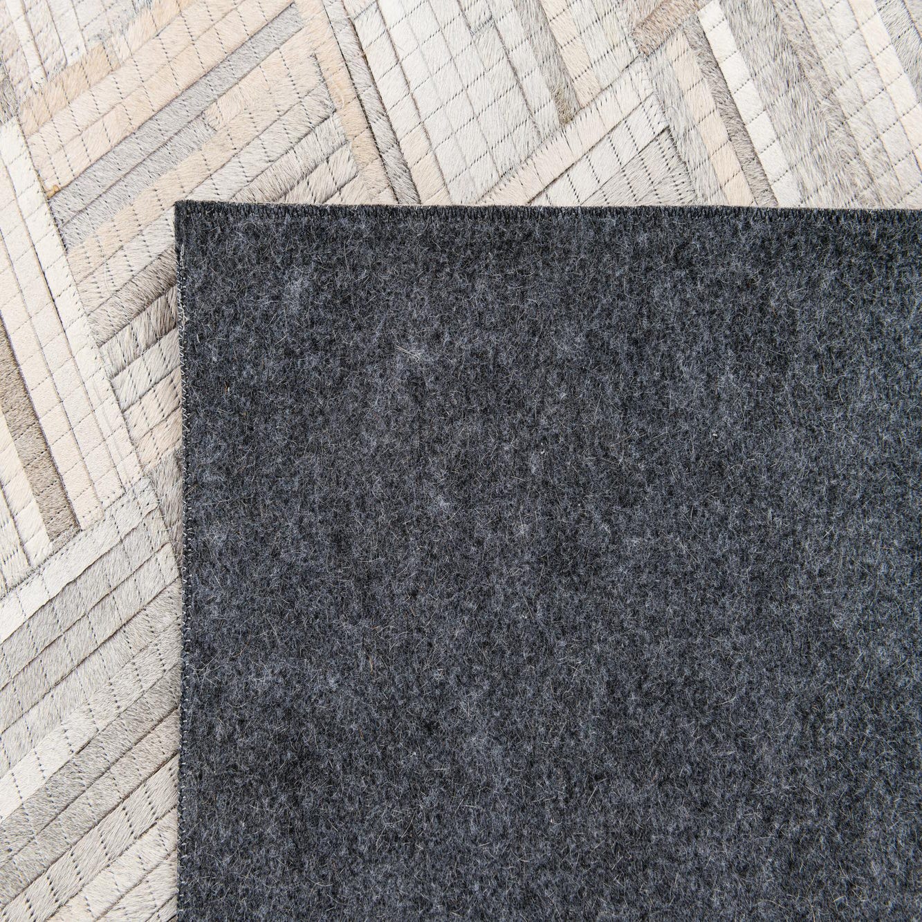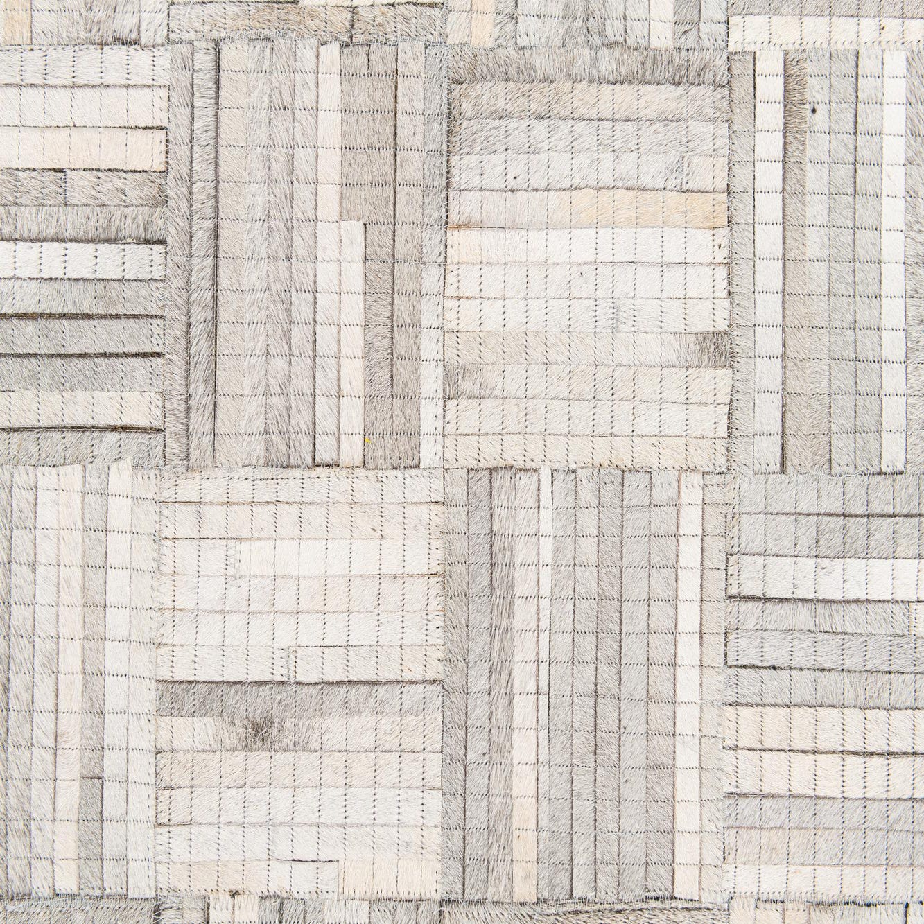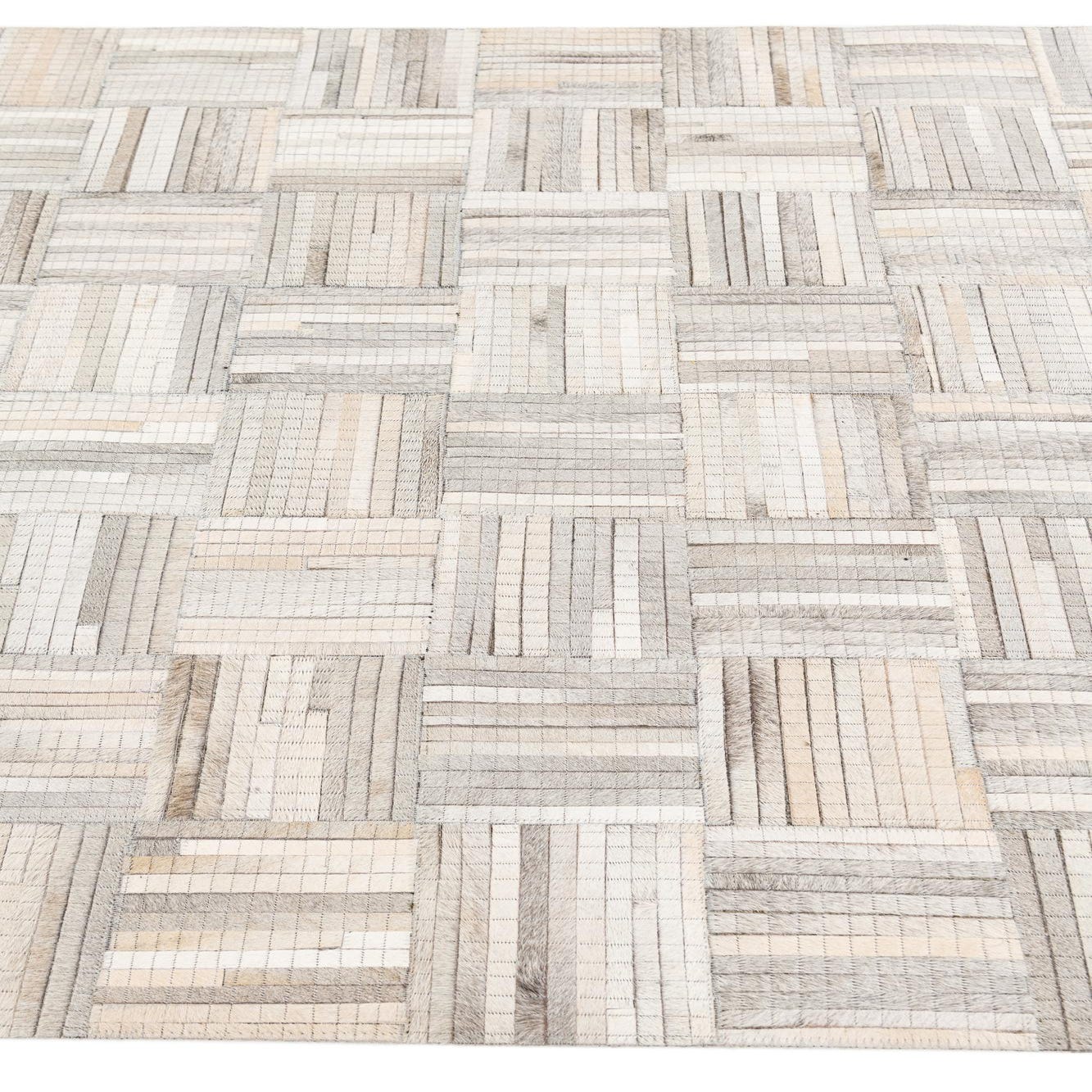 A 4x6 rectangular Cowhide Stocks rug featuring a modern patchwork design in varying shades of gray and silver.