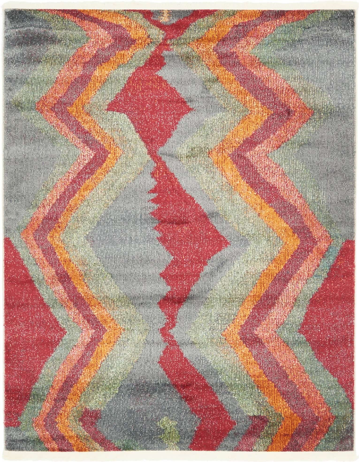 Primary color is Gray. Colors in this rug include: Gray, Blue, Orange, Purple, Pink, Red, Ivory.