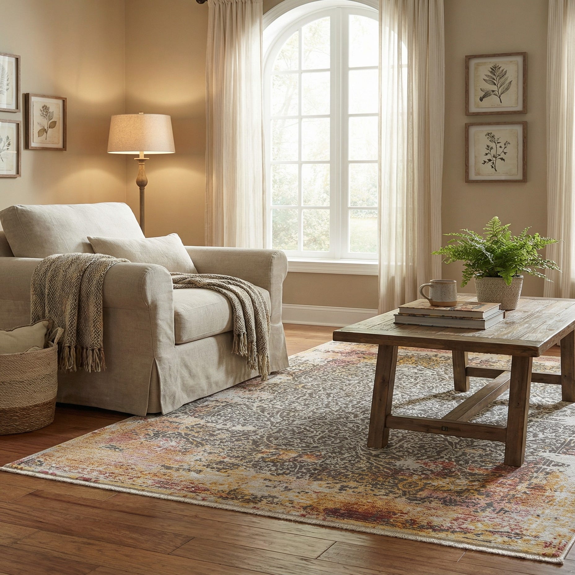 Machine-made from 100% polyester, the rug has a low, soft pile with a smooth hand and a slight sheen that catches light without being shiny. It works well in transitional and modern spaces—place it under a coffee table to anchor a living room with warm wood tones and brass accents, layer it in a cozy bedroom beneath the foot of the bed with blush or ivory linens, or use it to introduce color and pattern in an entry or sitting area. Pair with velvet upholstery in deep burgundy or neutral sofas and gold-accented lighting for a cohesive, inviting arrangement.