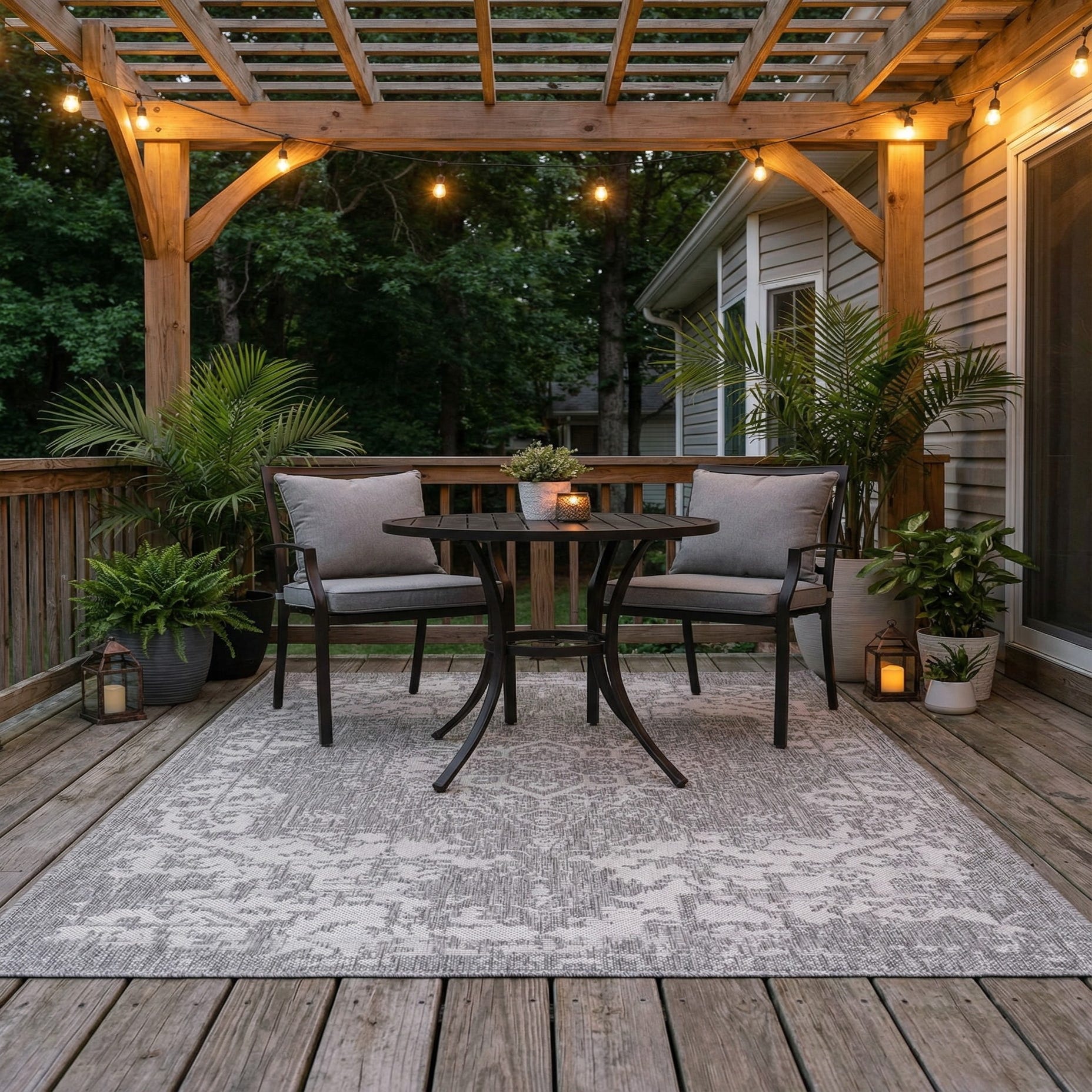 This neutral gray-and-ivory palette works well in a range of settings: pair it with a modern coastal seating group or a contemporary living room to reinforce a calm, monochromatic scheme; use it on a covered patio or balcony to anchor an outdoor dining set; or layer it in a transitional entry or home office to add subtle pattern without overpowering existing furnishings. The rug’s understated look complements wood, metal, and rattan finishes and adapts easily to both minimalist and layered interior styles.