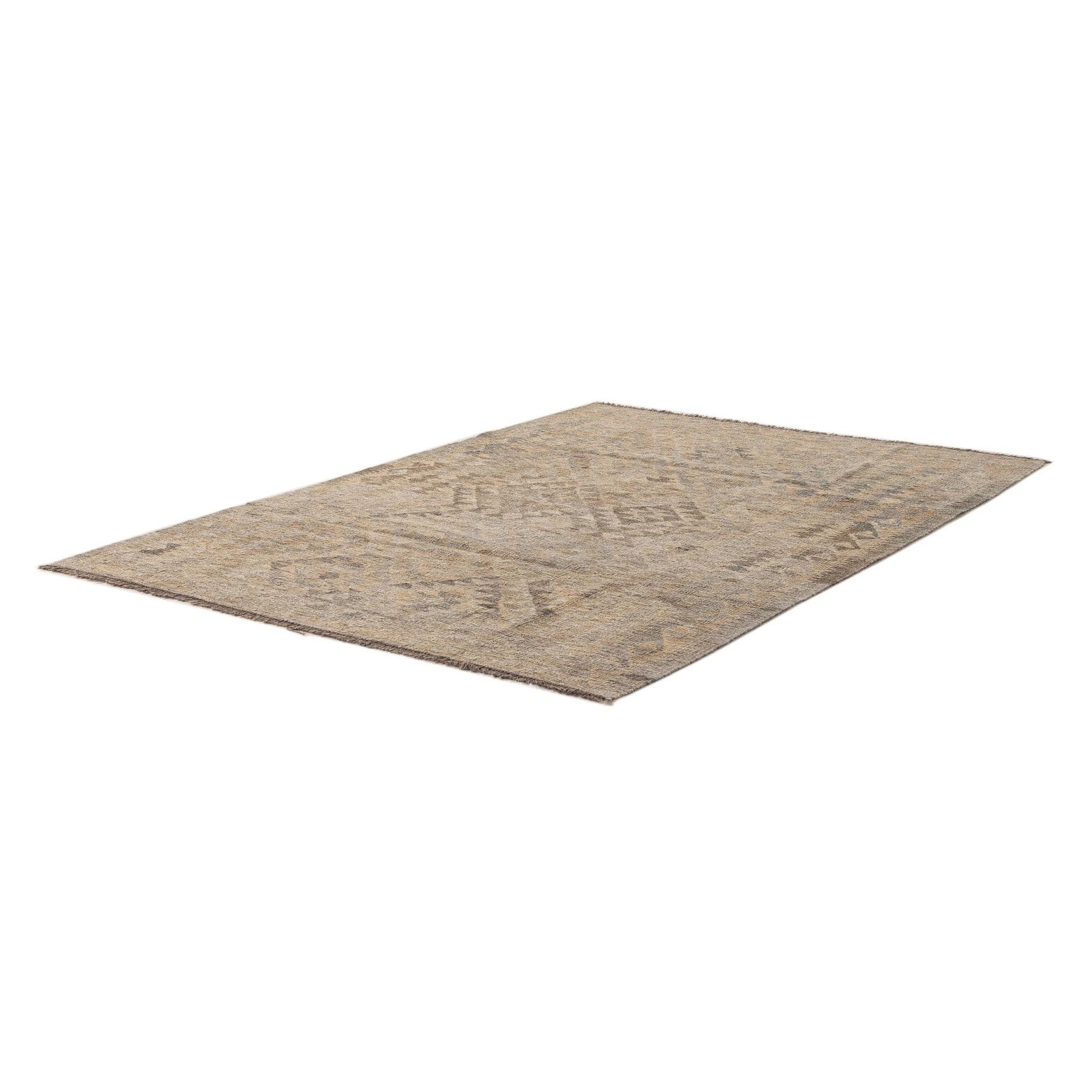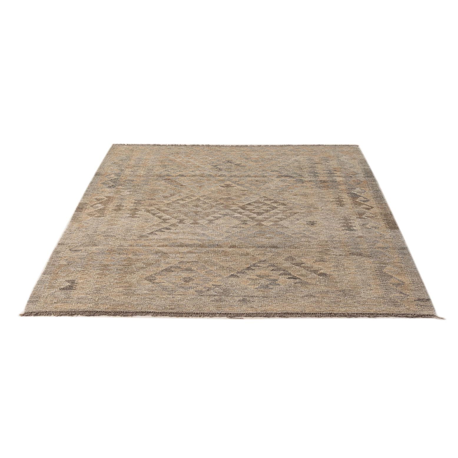A 4x6 rectangular Kilim Maymana rug with a flatweave, featuring gray and silver tribal patterns.