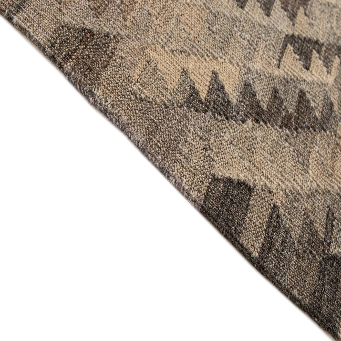 A 4x6 rectangular Kilim Maymana rug with a tribal geometric pattern in varying shades of gray, silver, and beige.
