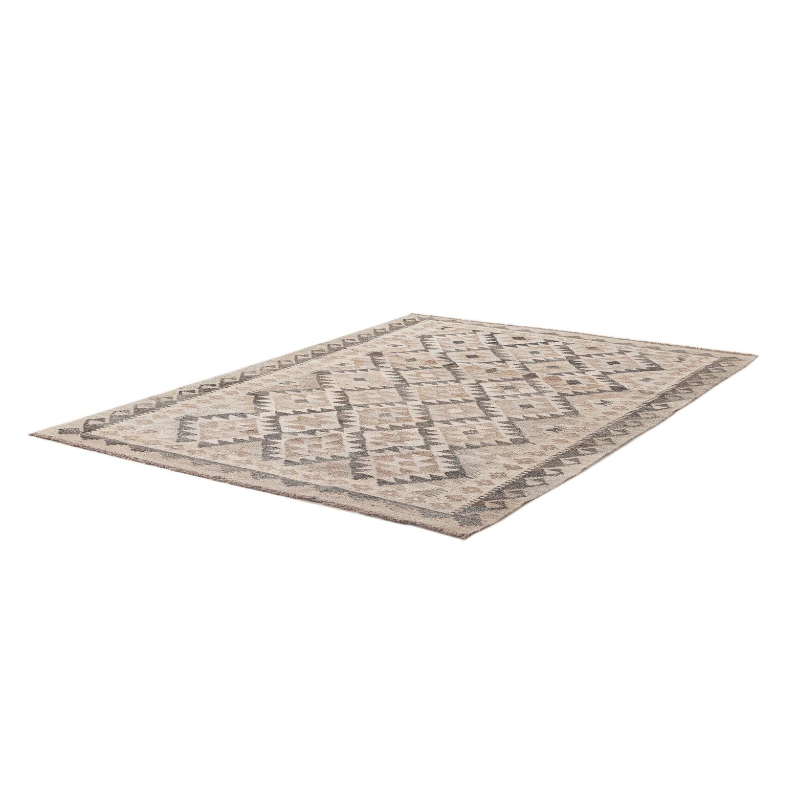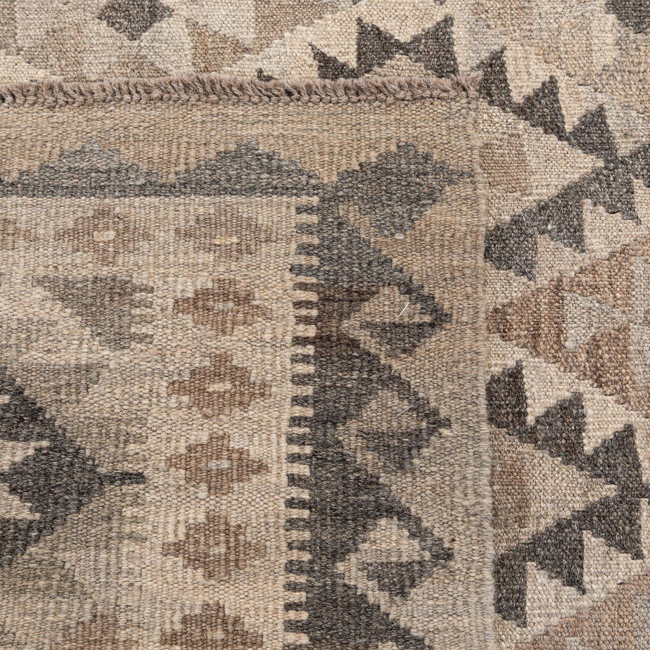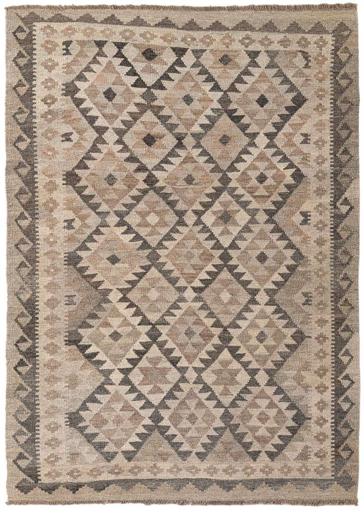 A 4x6 rectangular Kilim Maymana rug featuring a tribal geometric pattern in shades of gray and silver.