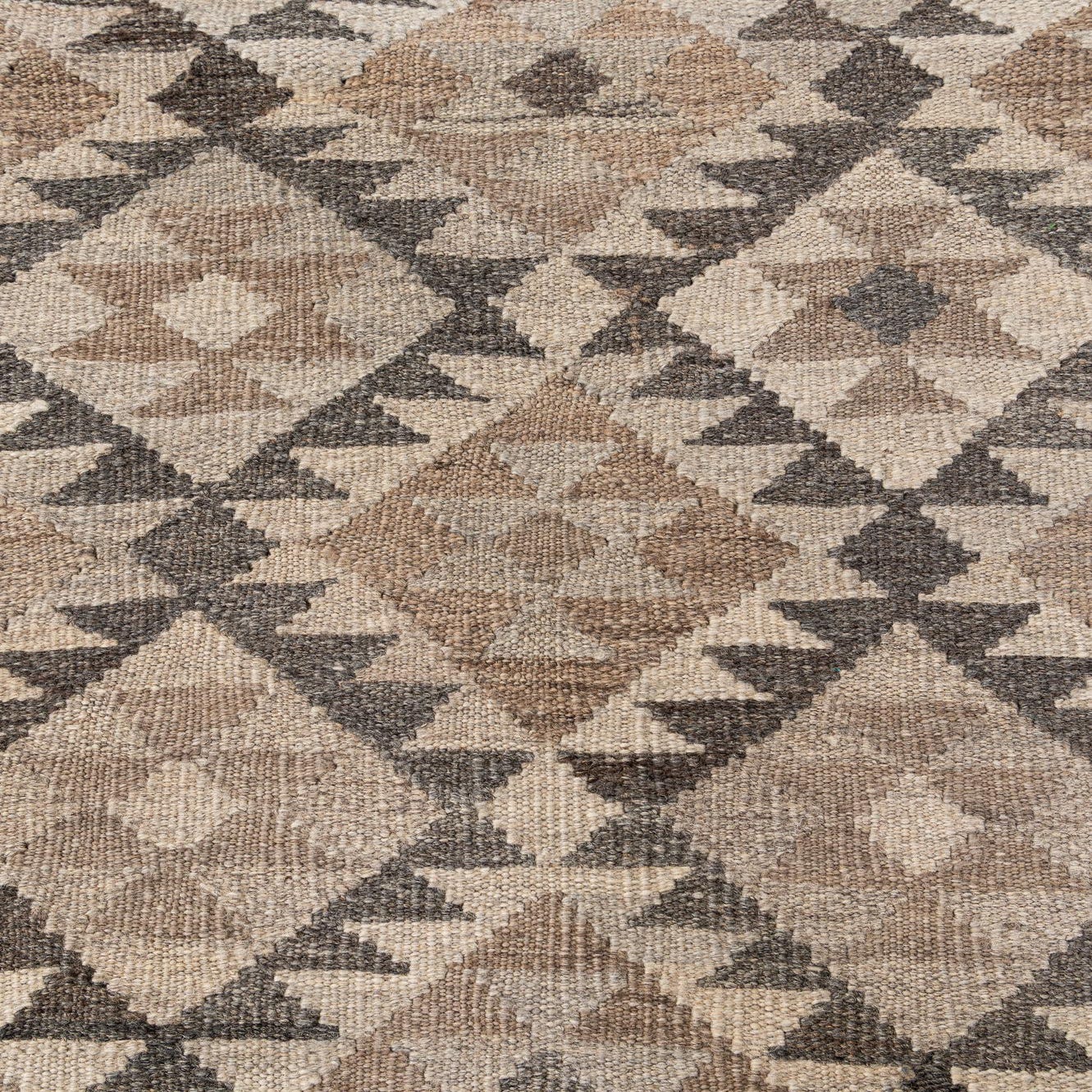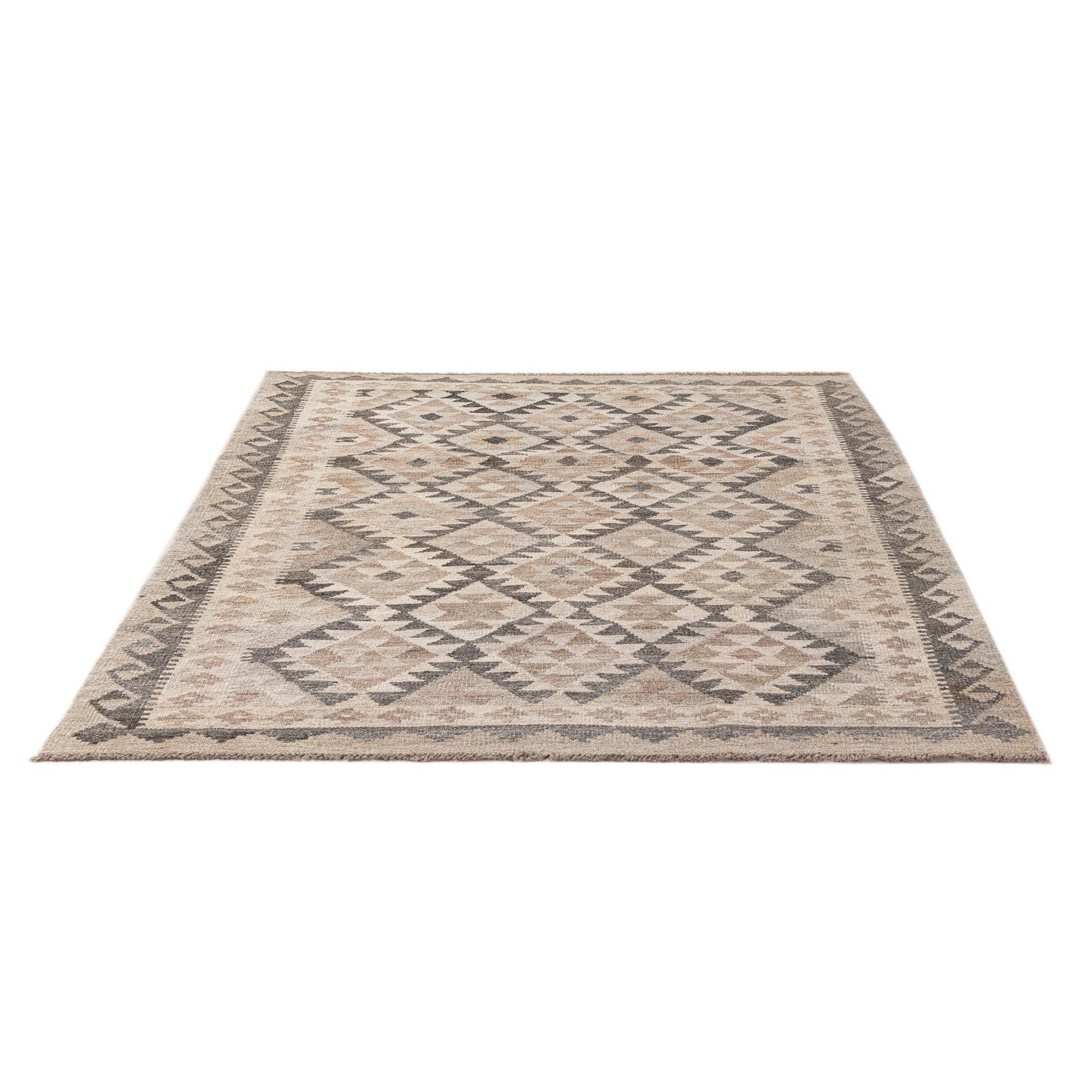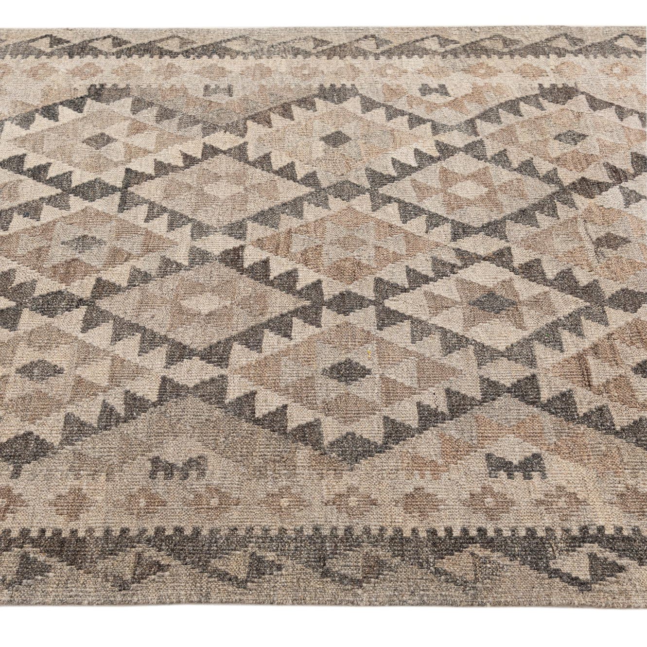 A 4x6 rectangular Kilim Maymana rug featuring a tribal geometric pattern in shades of gray and silver.