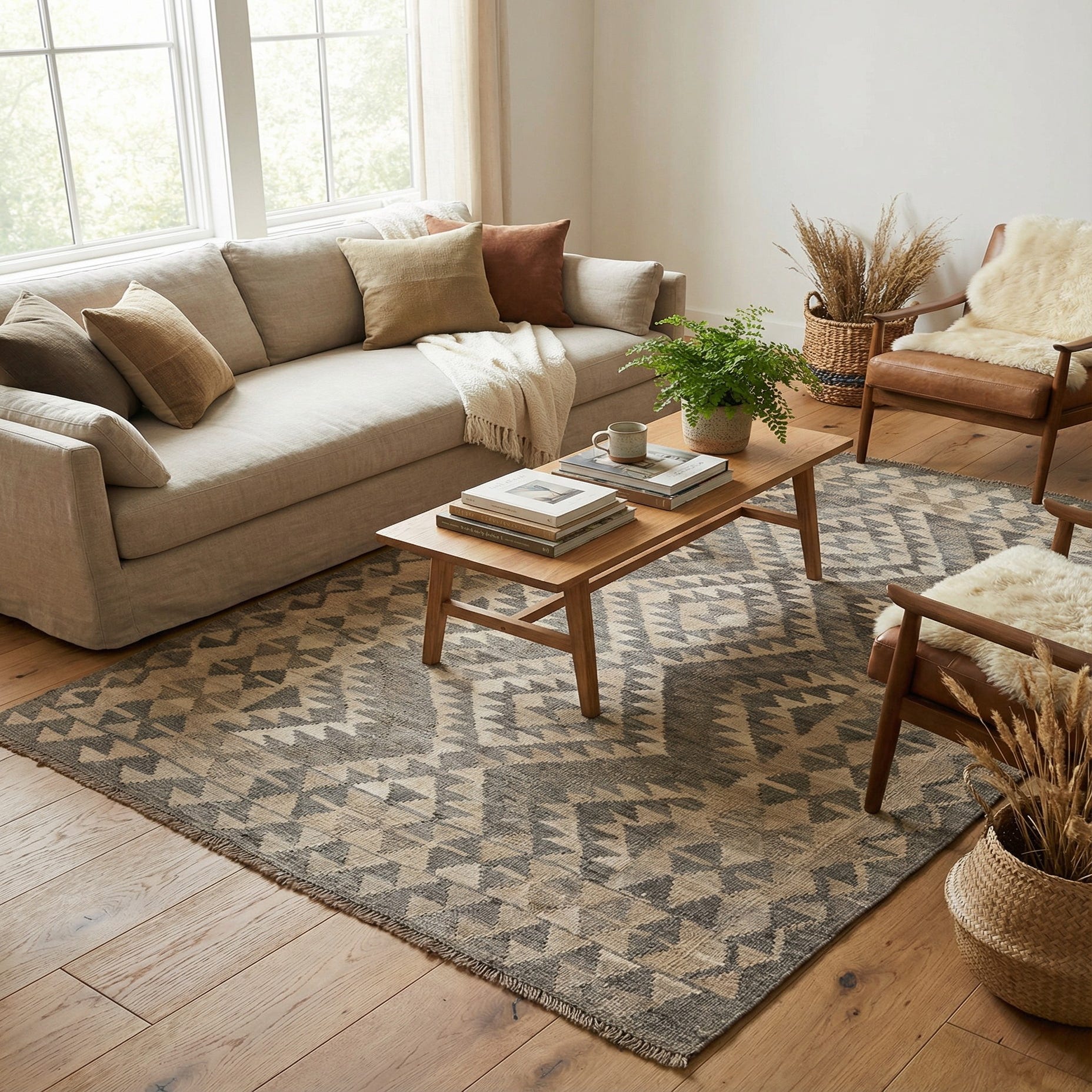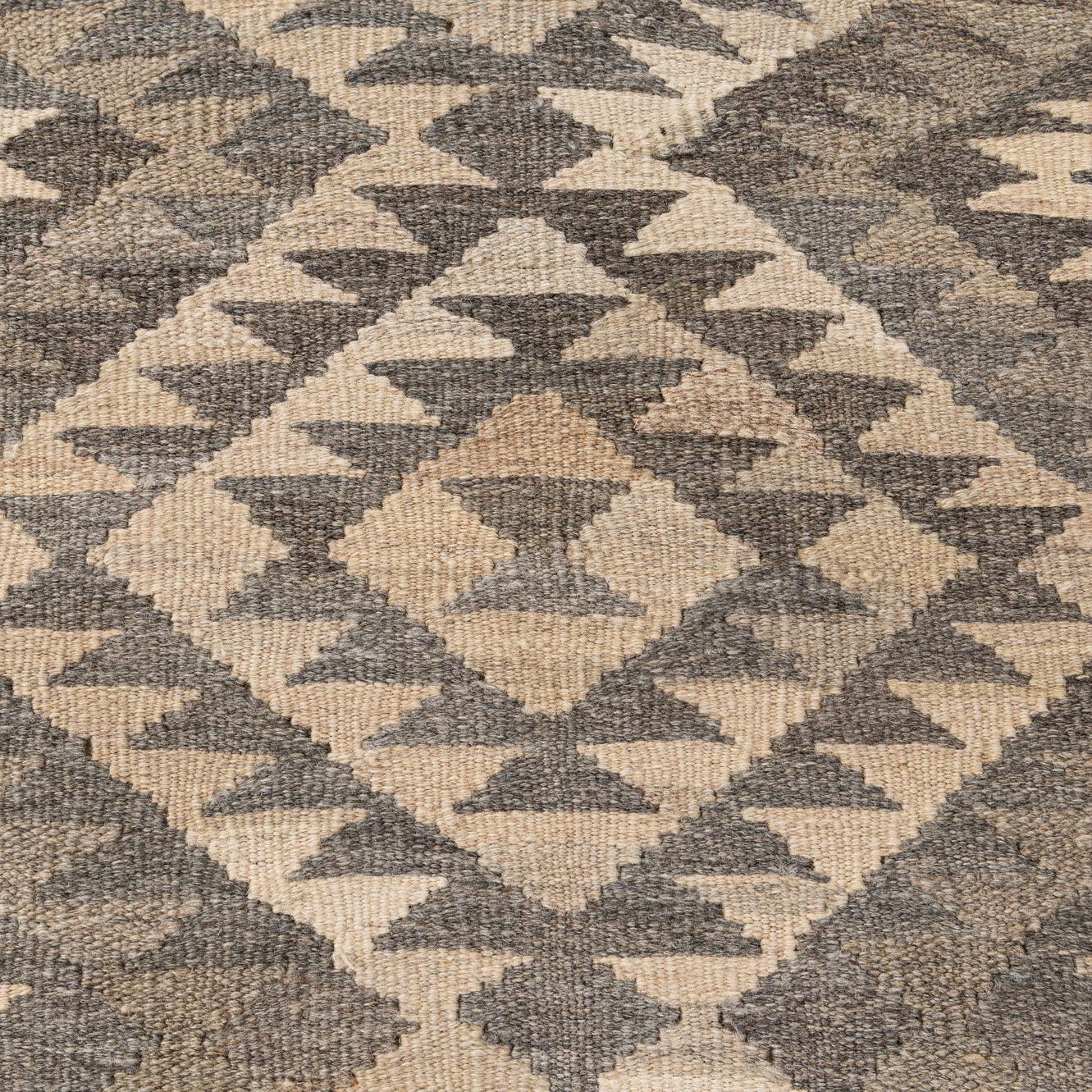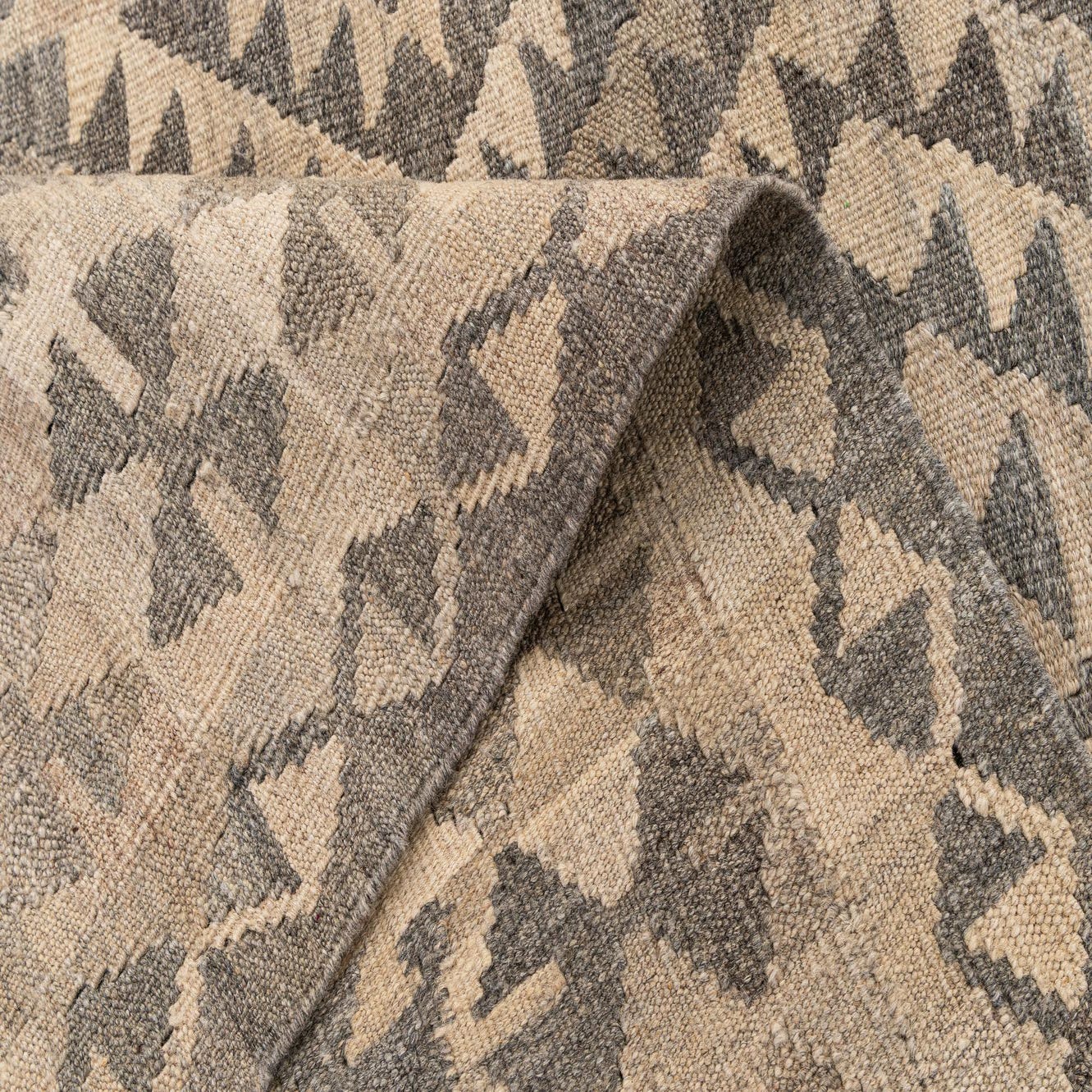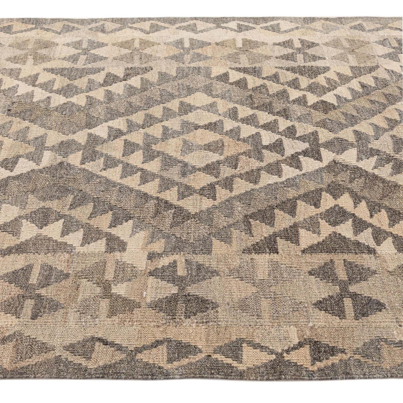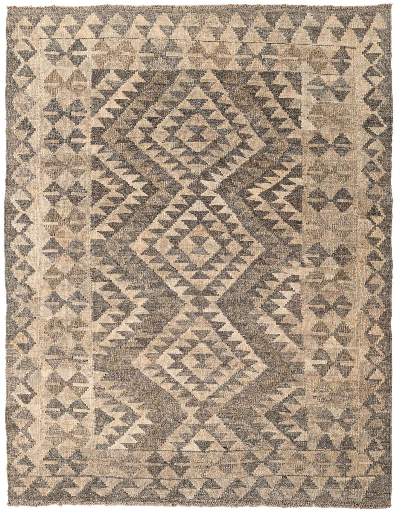 A 4x6 rectangular Kilim Maymana rug with a tribal geometric pattern in varying shades of gray and beige.