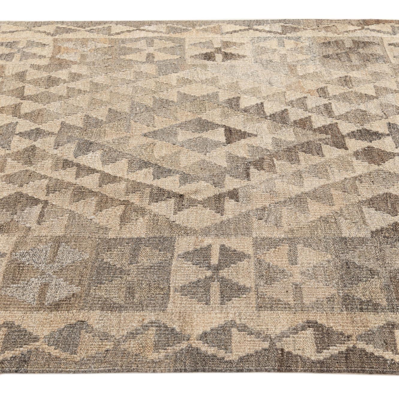 A 4x6 rectangular Kilim Maymana wool rug featuring a tribal geometric pattern in varying shades of gray and silver.
