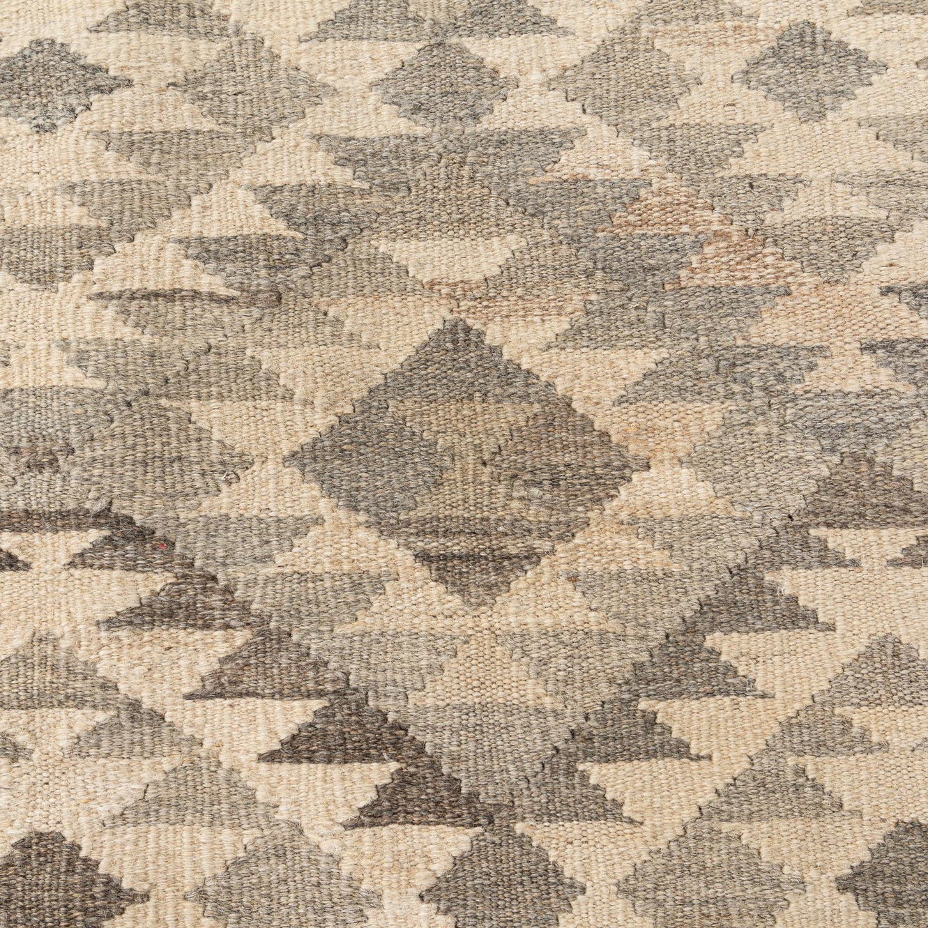 A 4x6 rectangular gray and beige tribal flatweave rug with geometric diamond and triangle patterns, suitable for a living room.