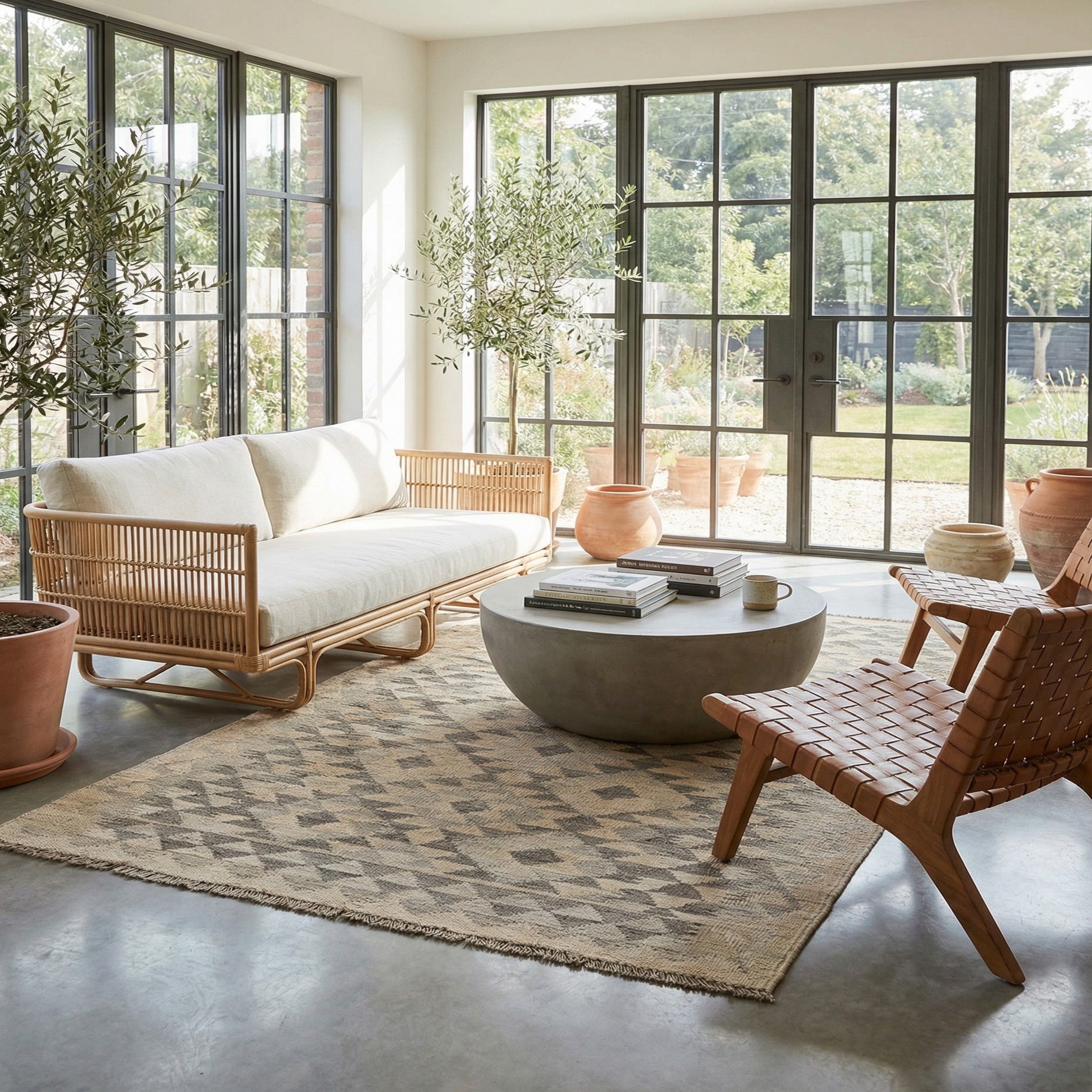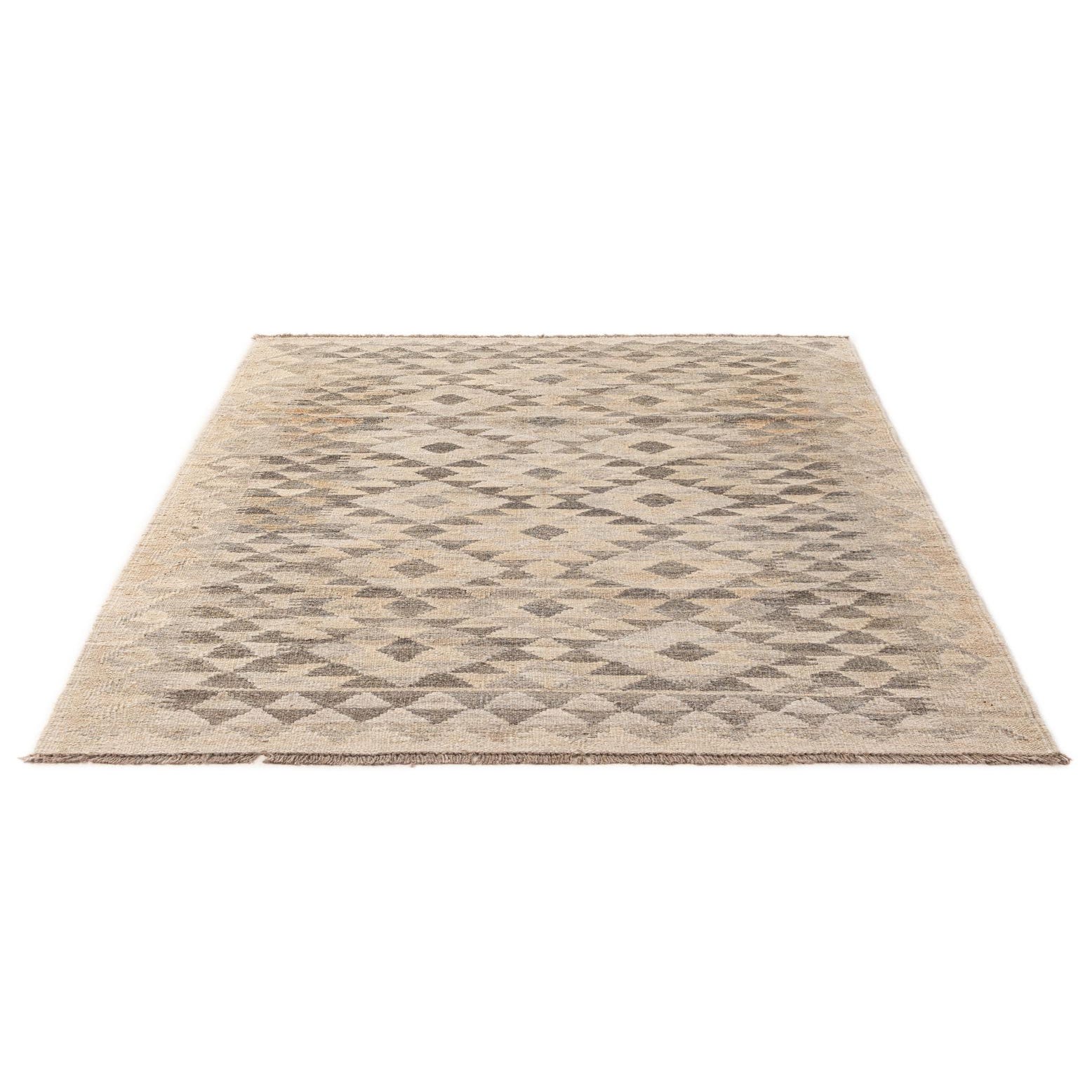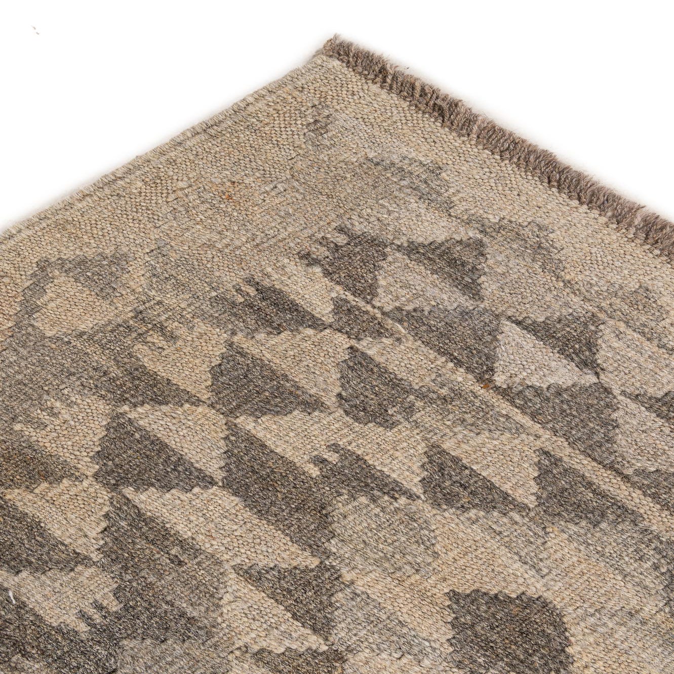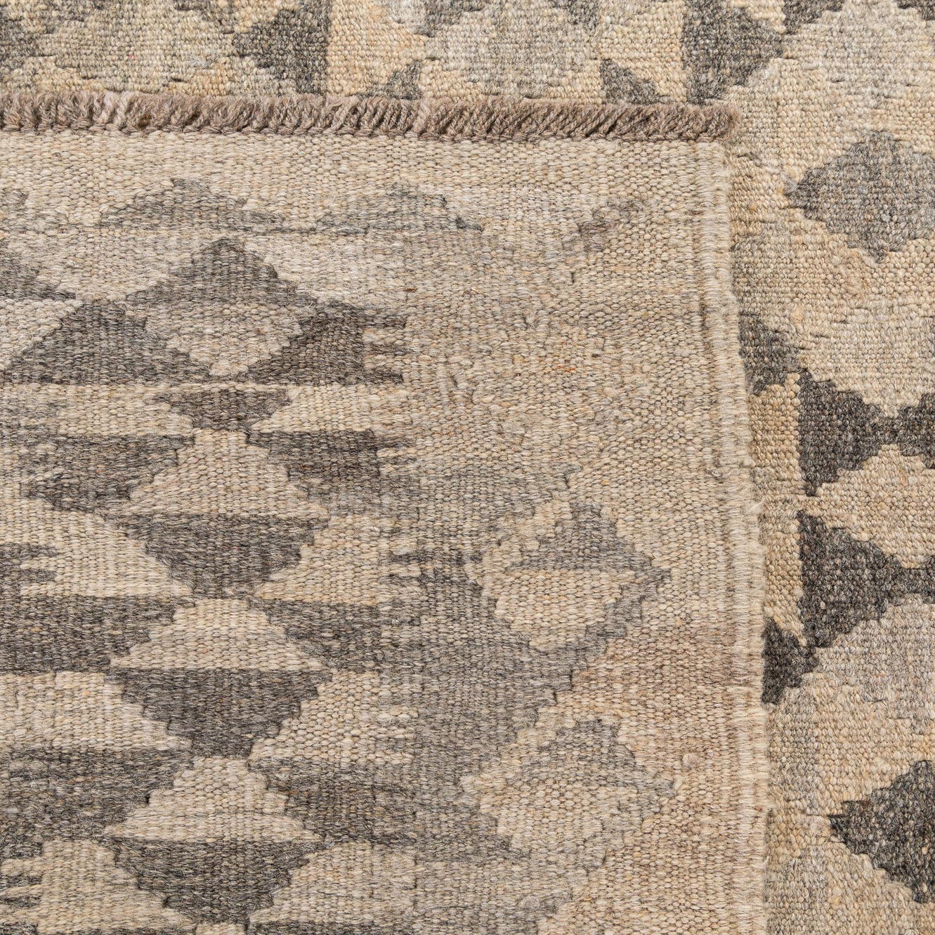 A 4x6 rectangular Kilim Maymana rug featuring a tribal geometric pattern in shades of gray and silver on a natural wool flatweave.