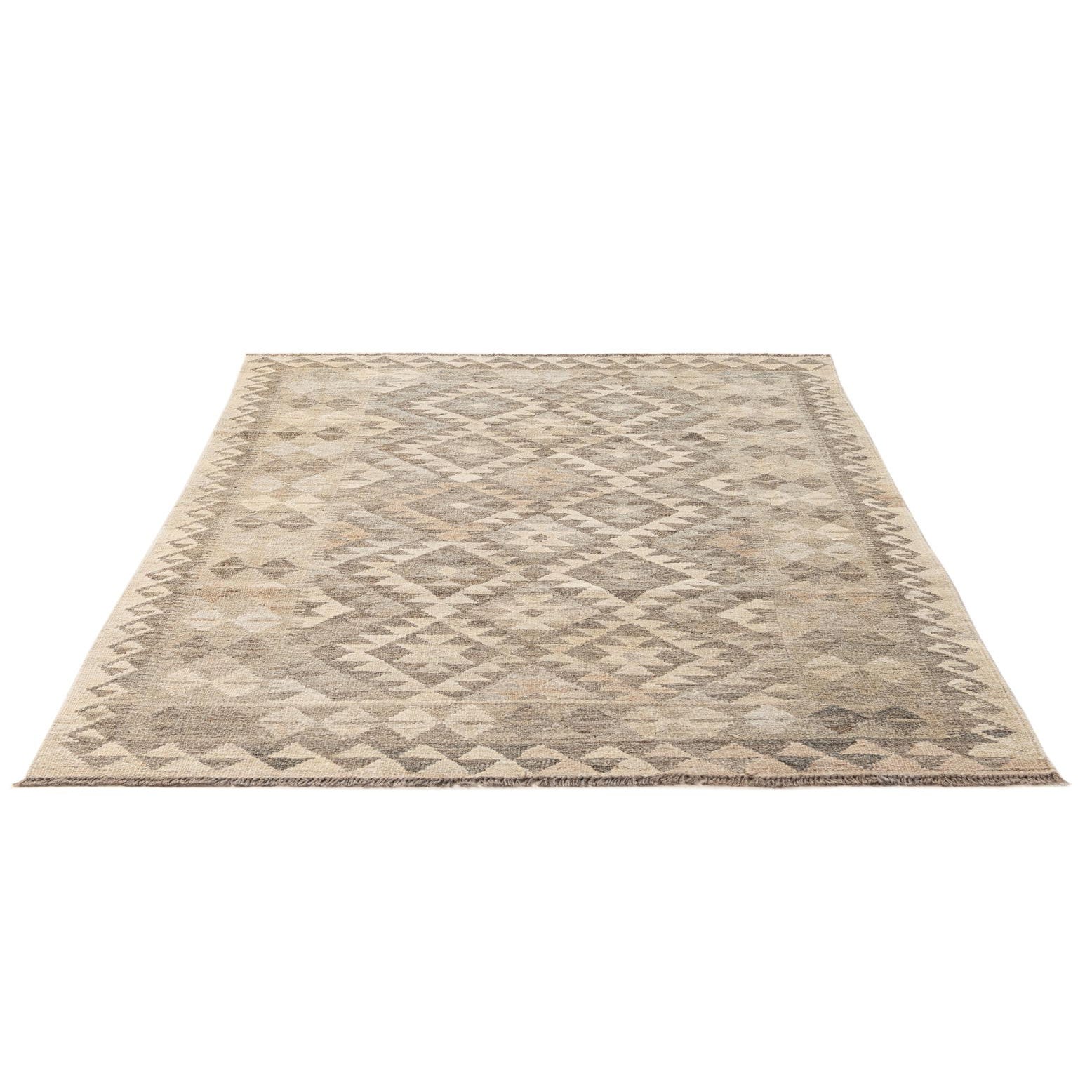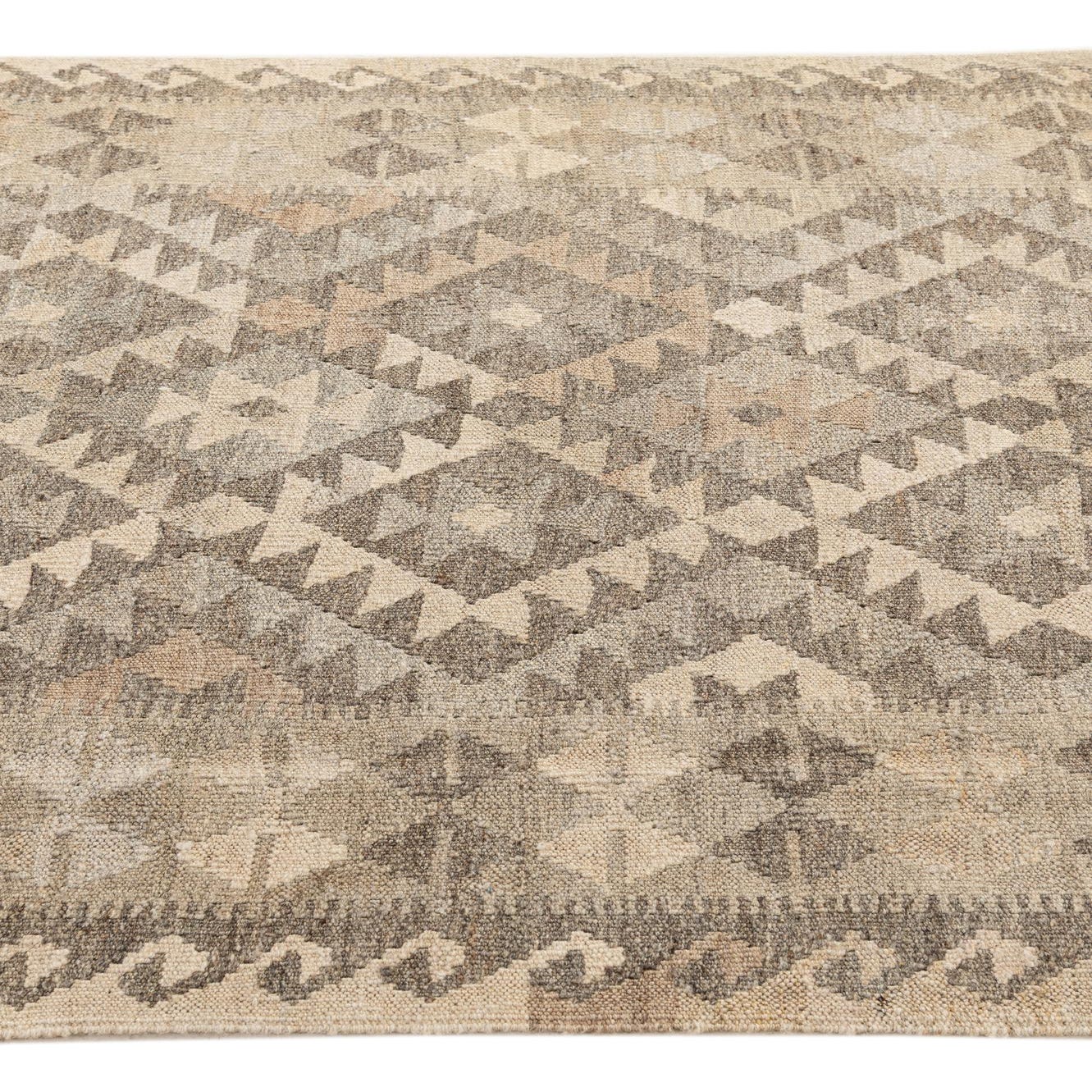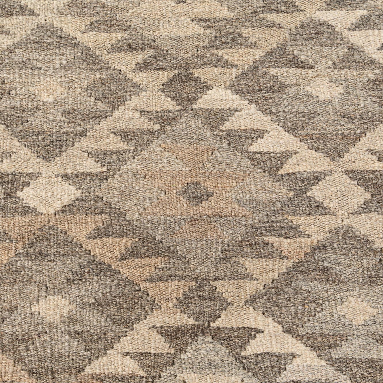 A 4x6 rectangular Kilim Maymana rug with a tribal geometric pattern in varying shades of gray and silver.