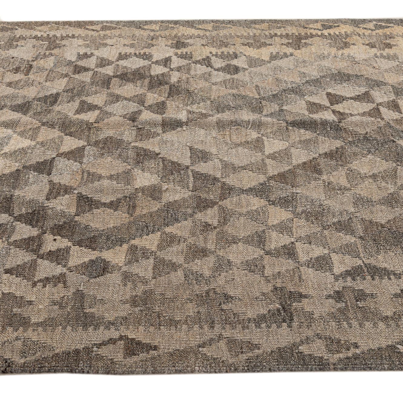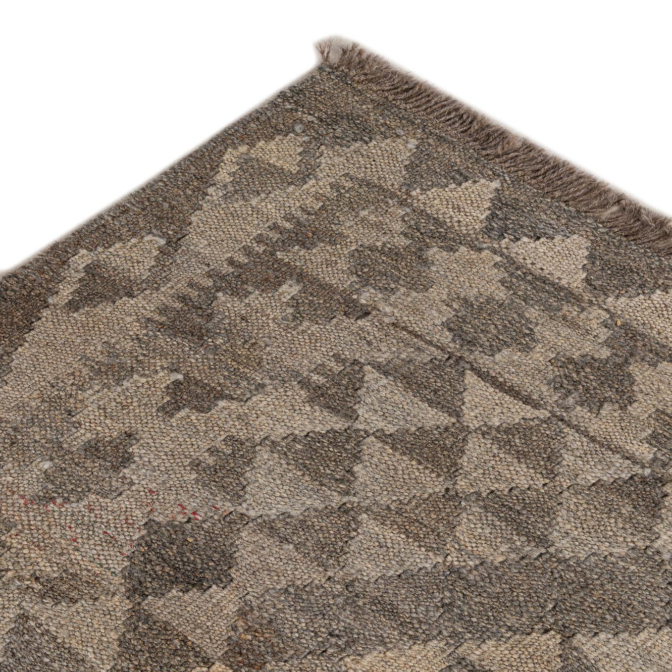 A 4x6 rectangular gray tribal flatweave rug with a modern geometric diamond pattern and fringed edges.