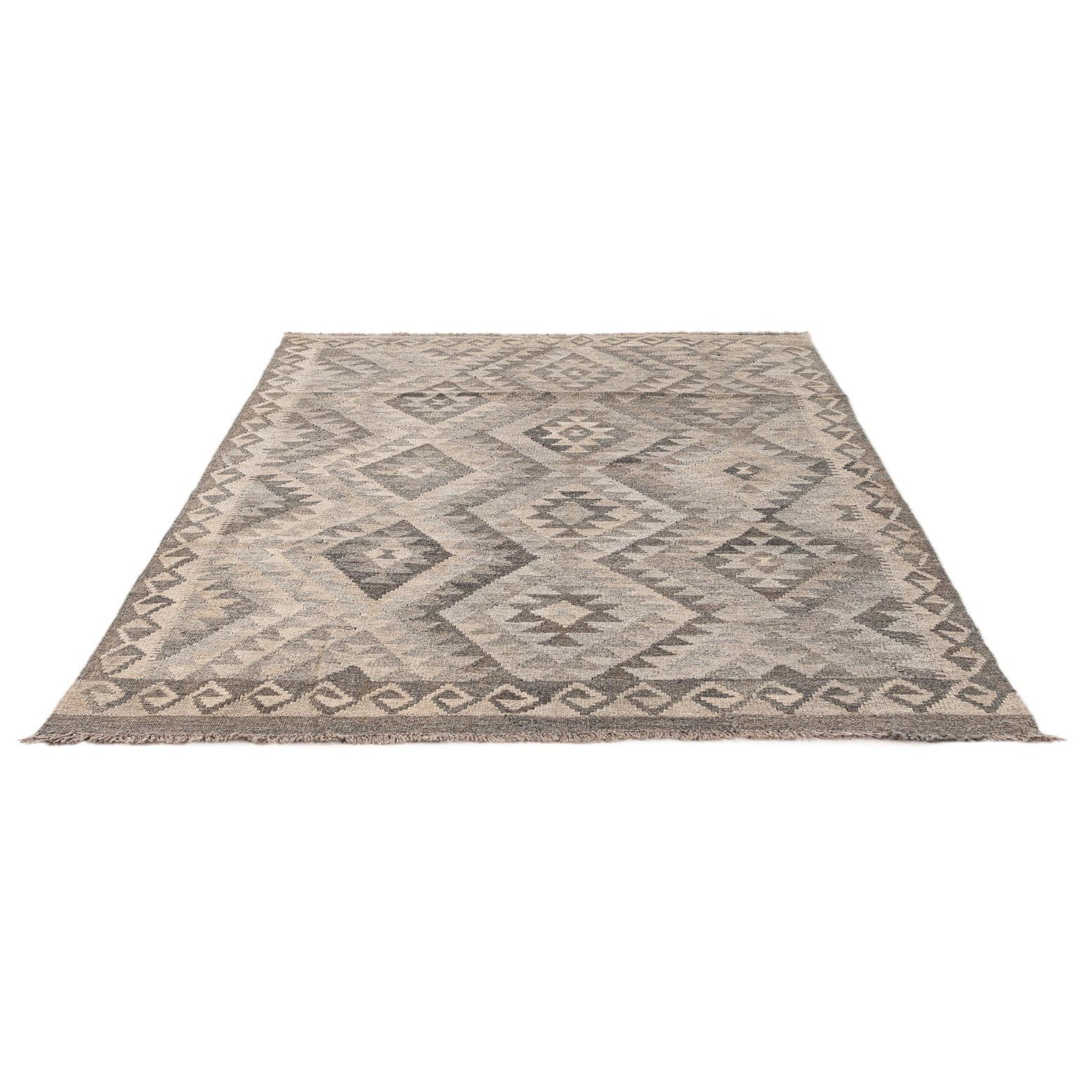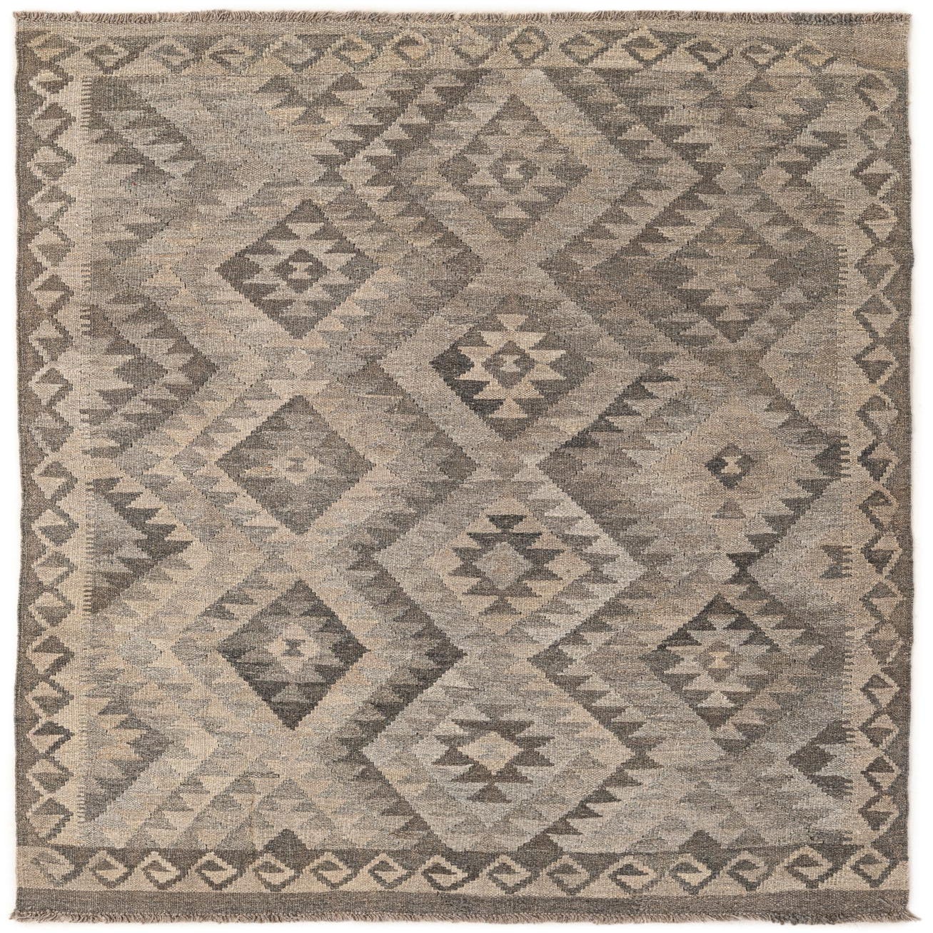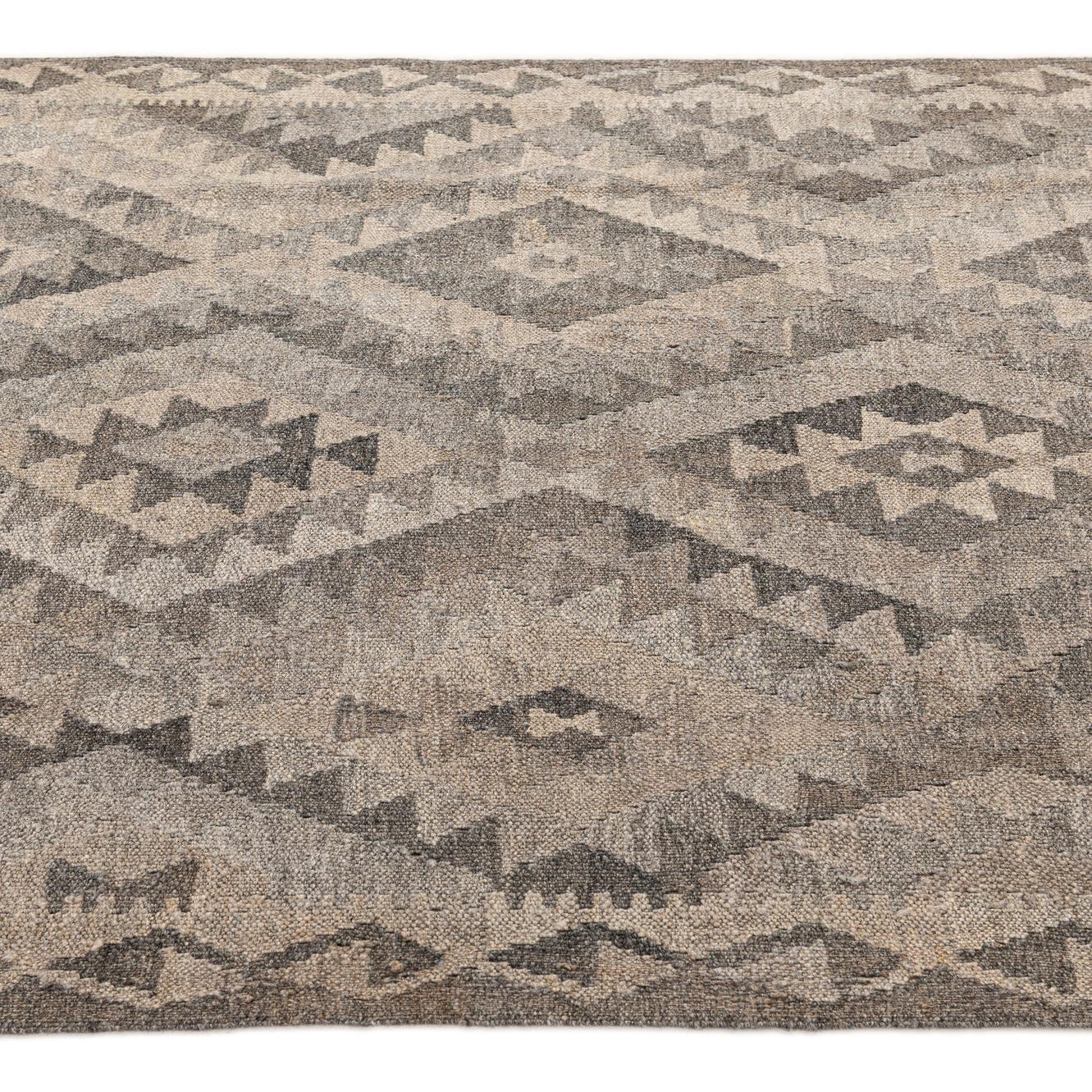 A 4x6 rectangular gray wool flatweave rug with a tribal diamond pattern, ideal for a living room.