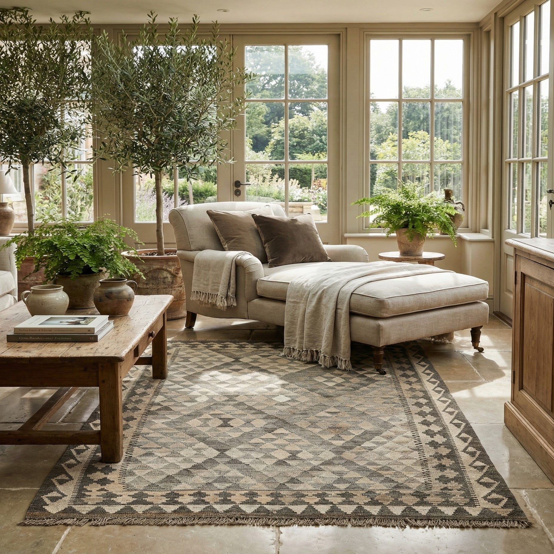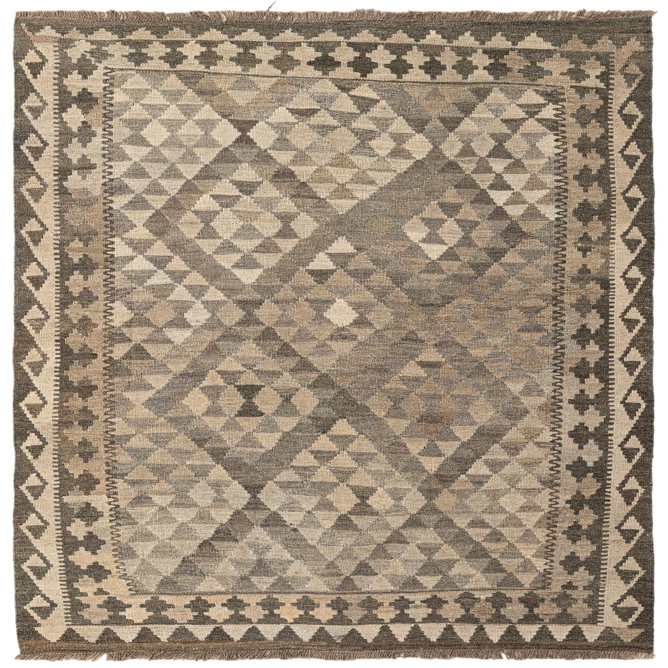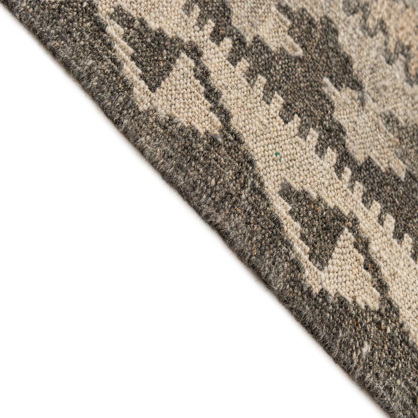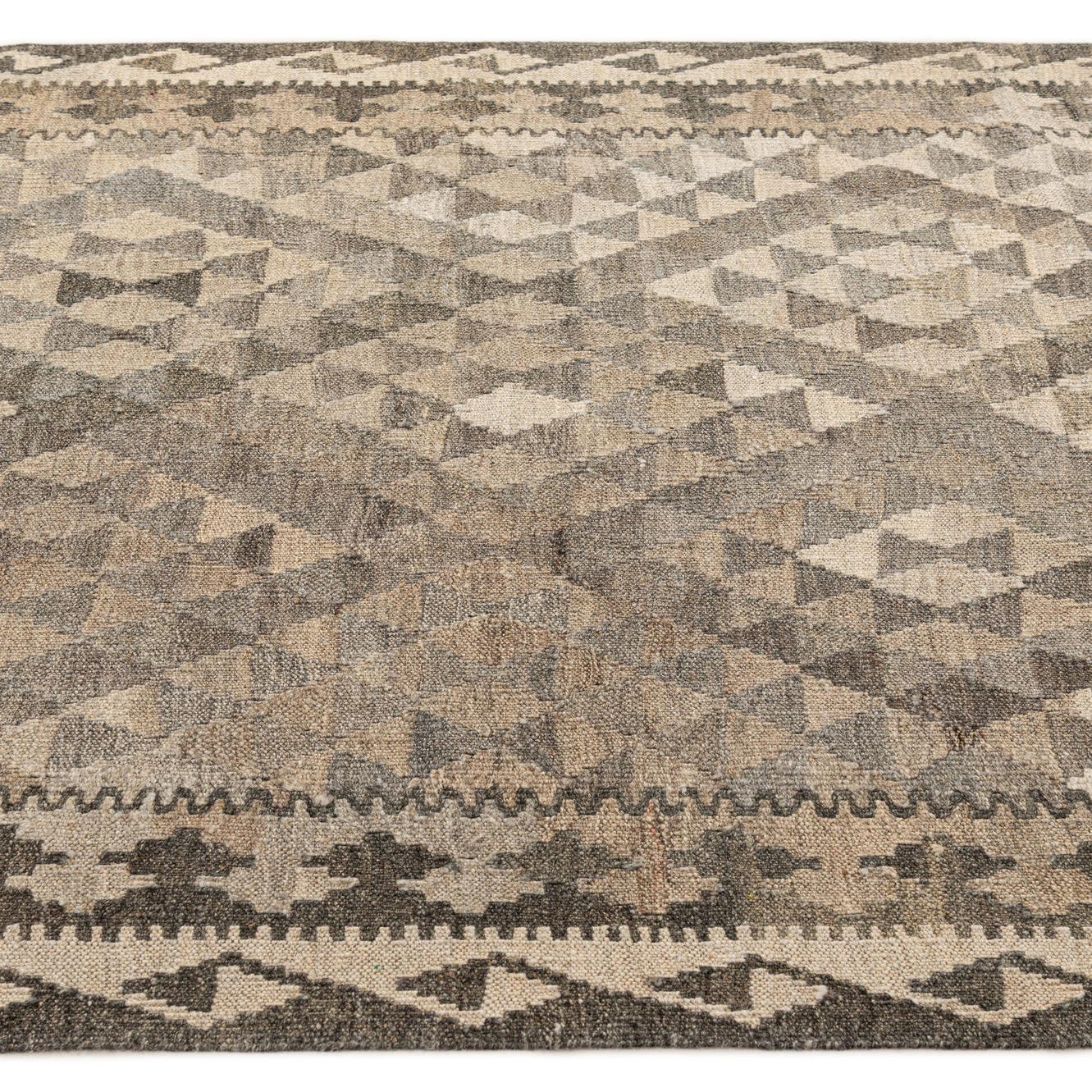 A 4x6 rectangular Kilim Maymana rug featuring a tribal geometric pattern in shades of gray and silver.