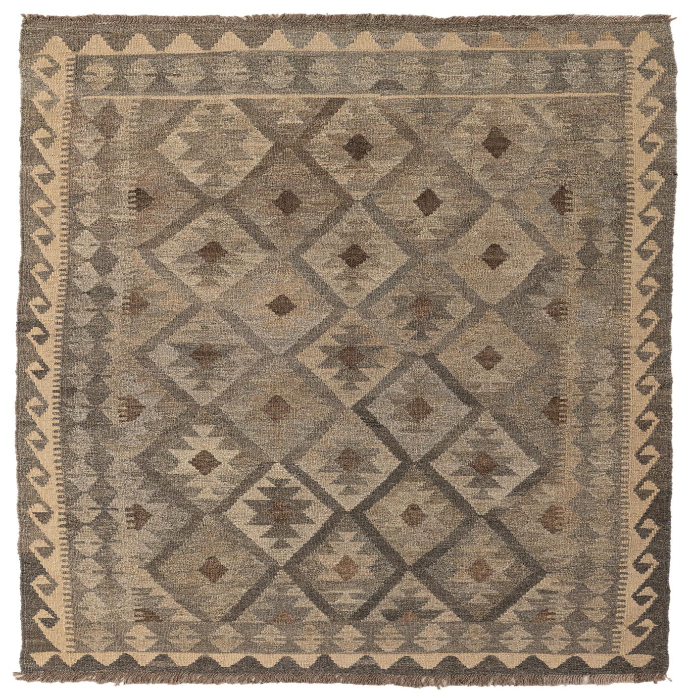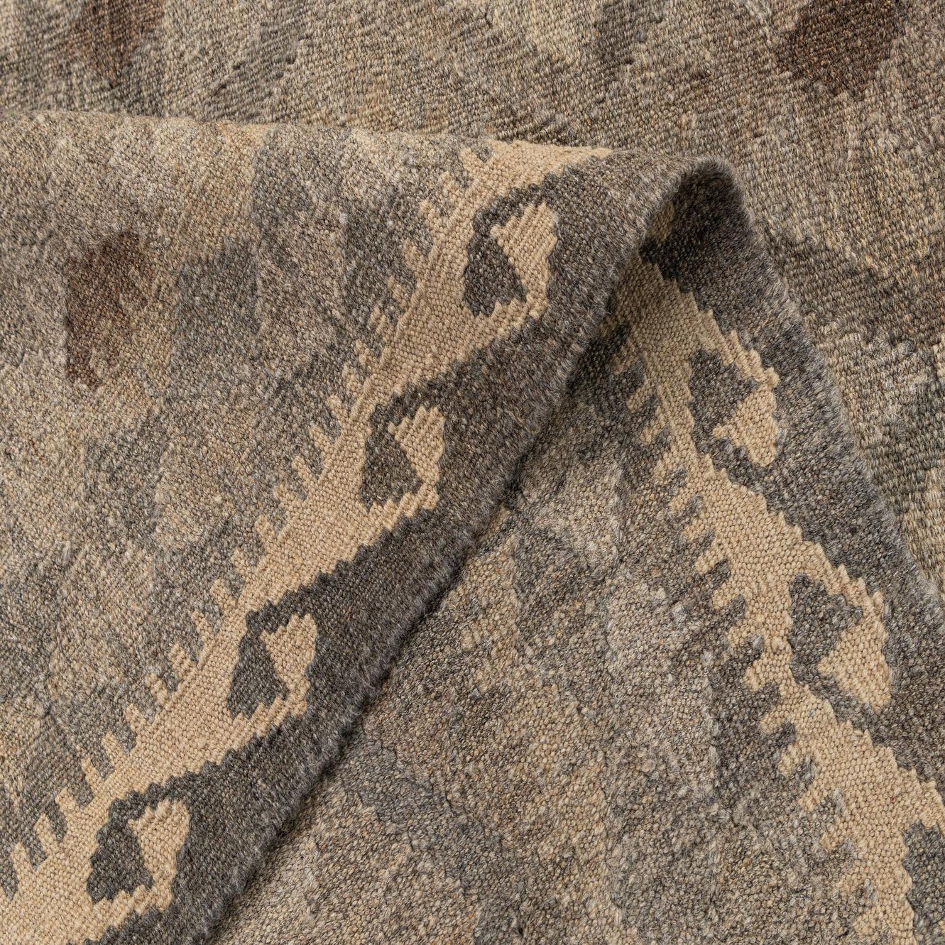 A 4x6 rectangular Kilim Maymana rug featuring a tribal geometric diamond pattern in varying shades of gray, silver, and beige.