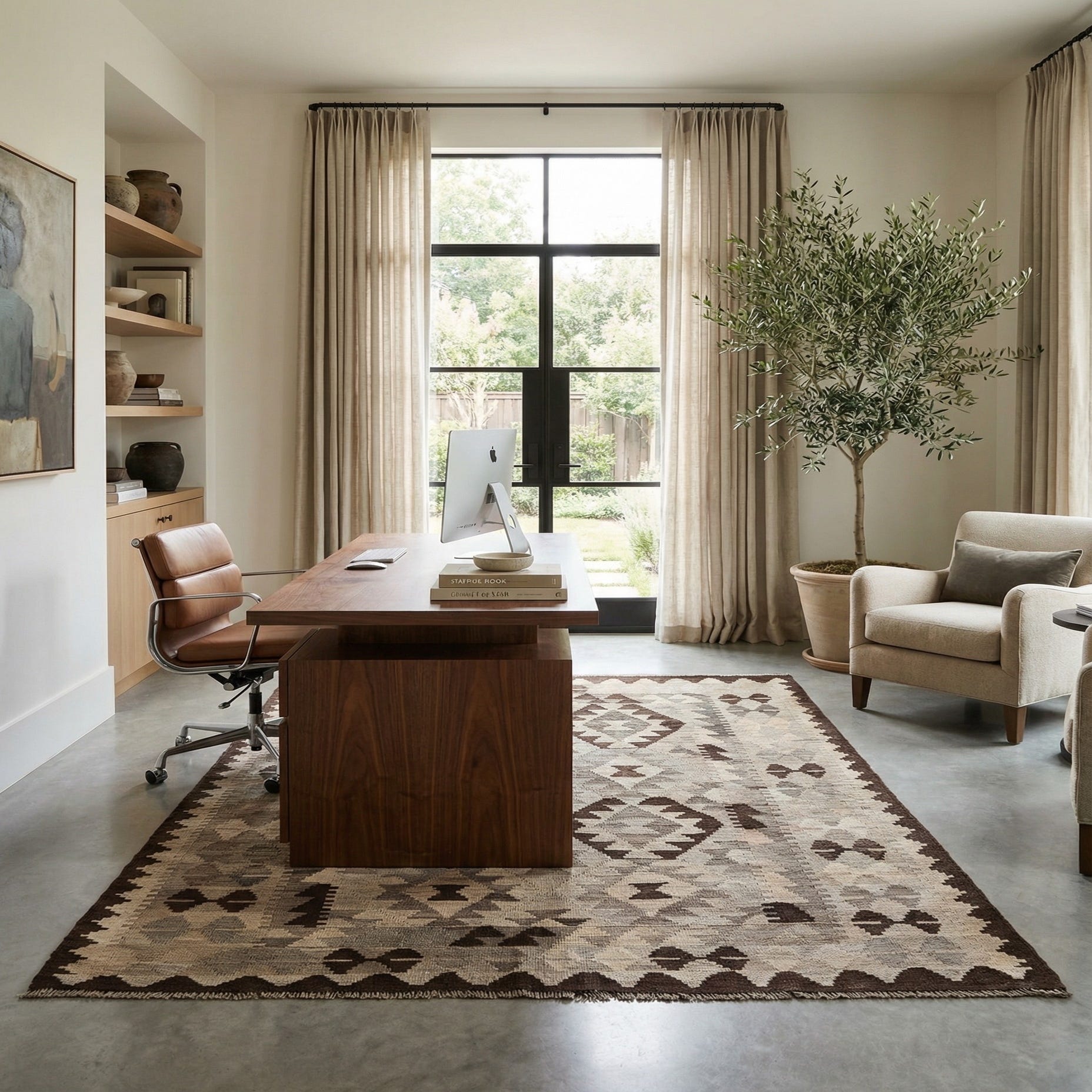 A 4x6 rectangular Kilim Maymana rug featuring a tribal geometric pattern in shades of gray, silver, and dark brown.
