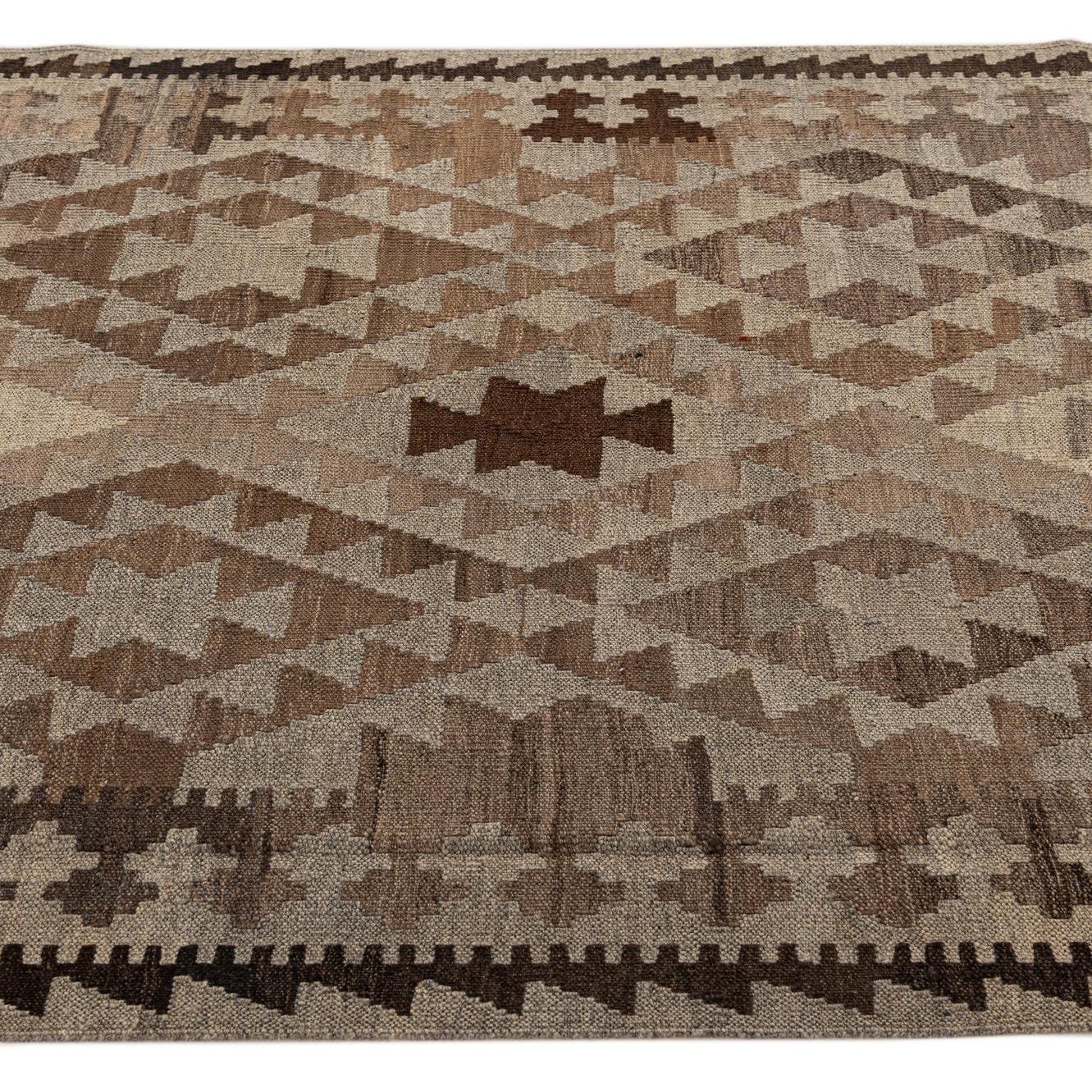 A 4x6 rectangular Kilim Maymana rug featuring a tribal geometric pattern in varying shades of gray, silver, and brown, suitable for an indoor living space.