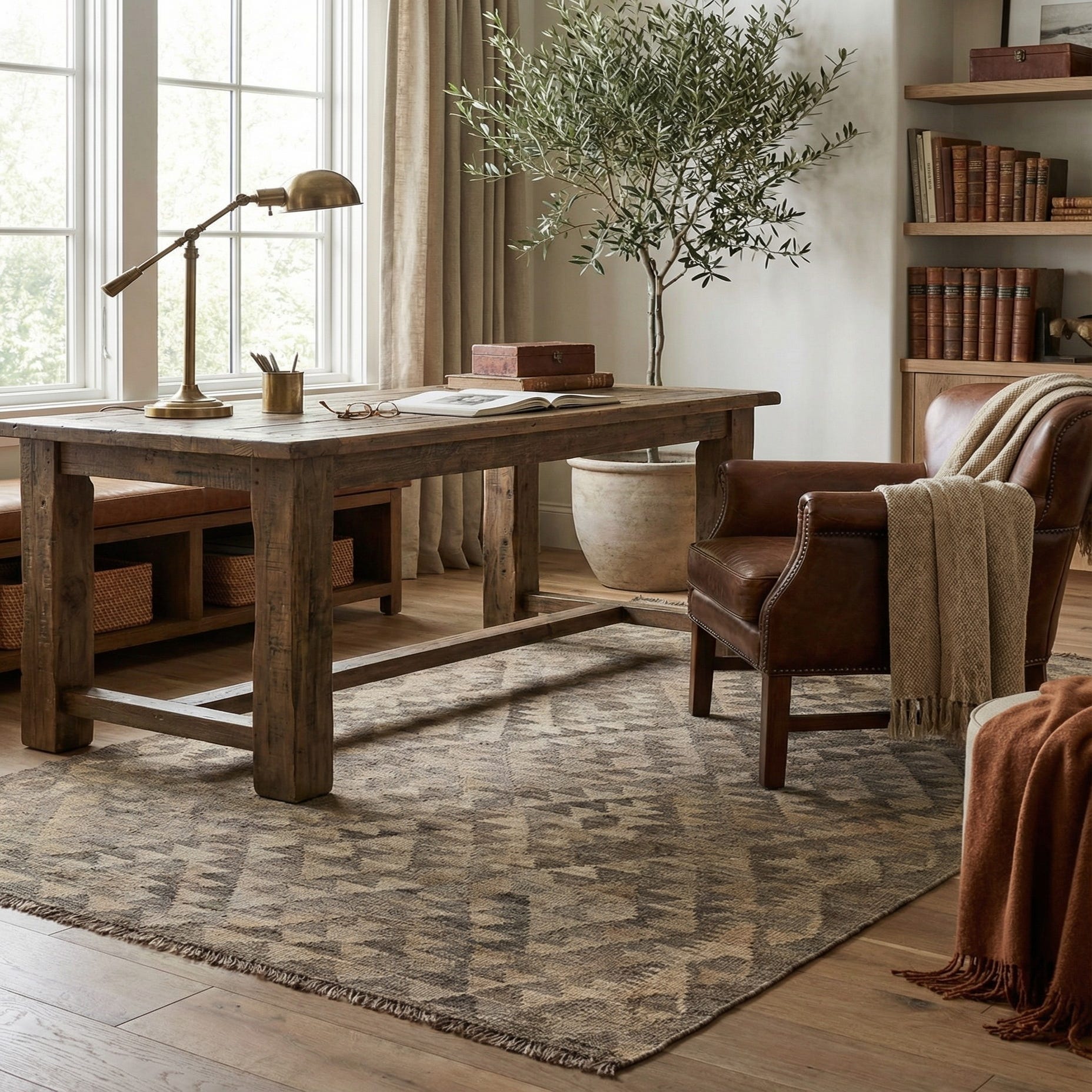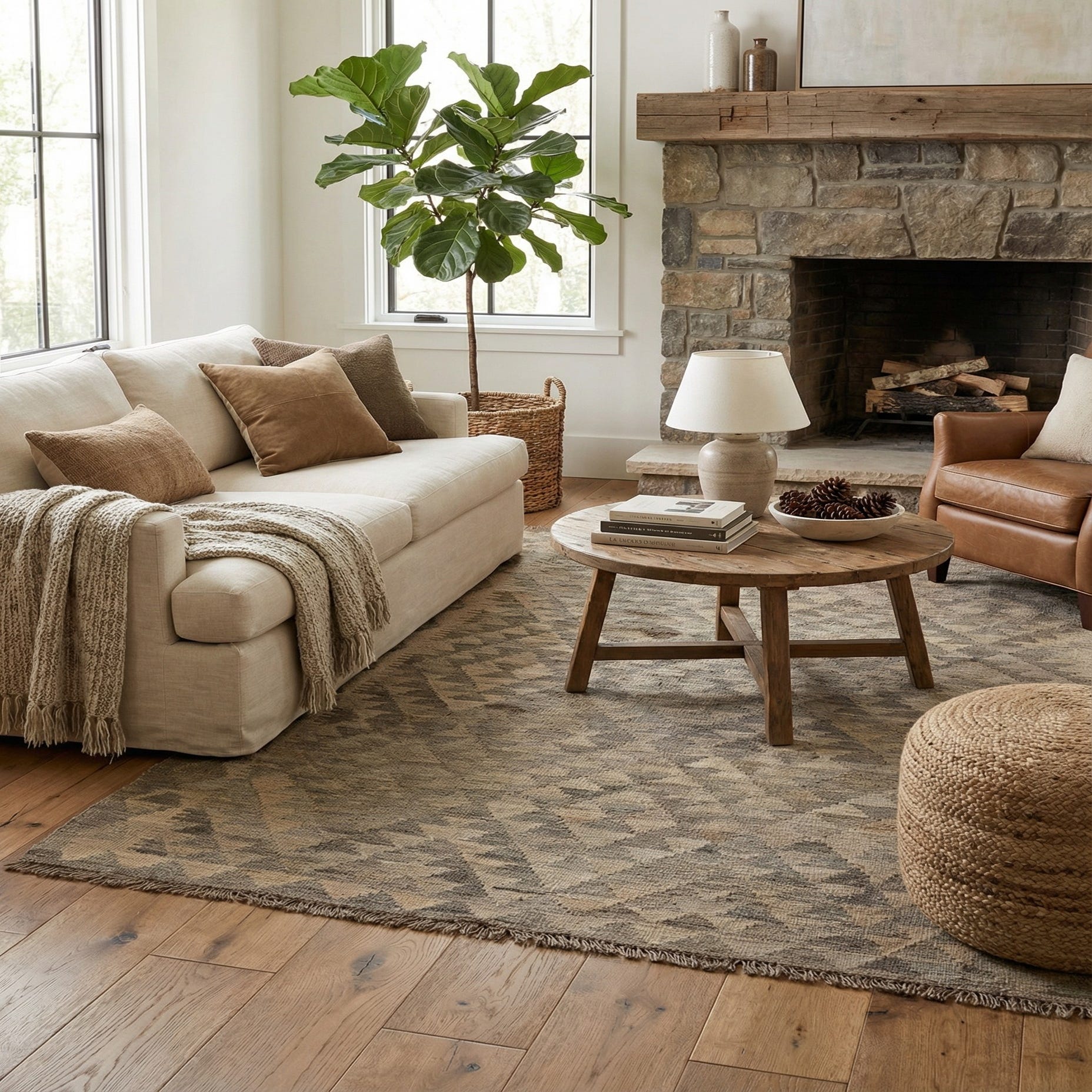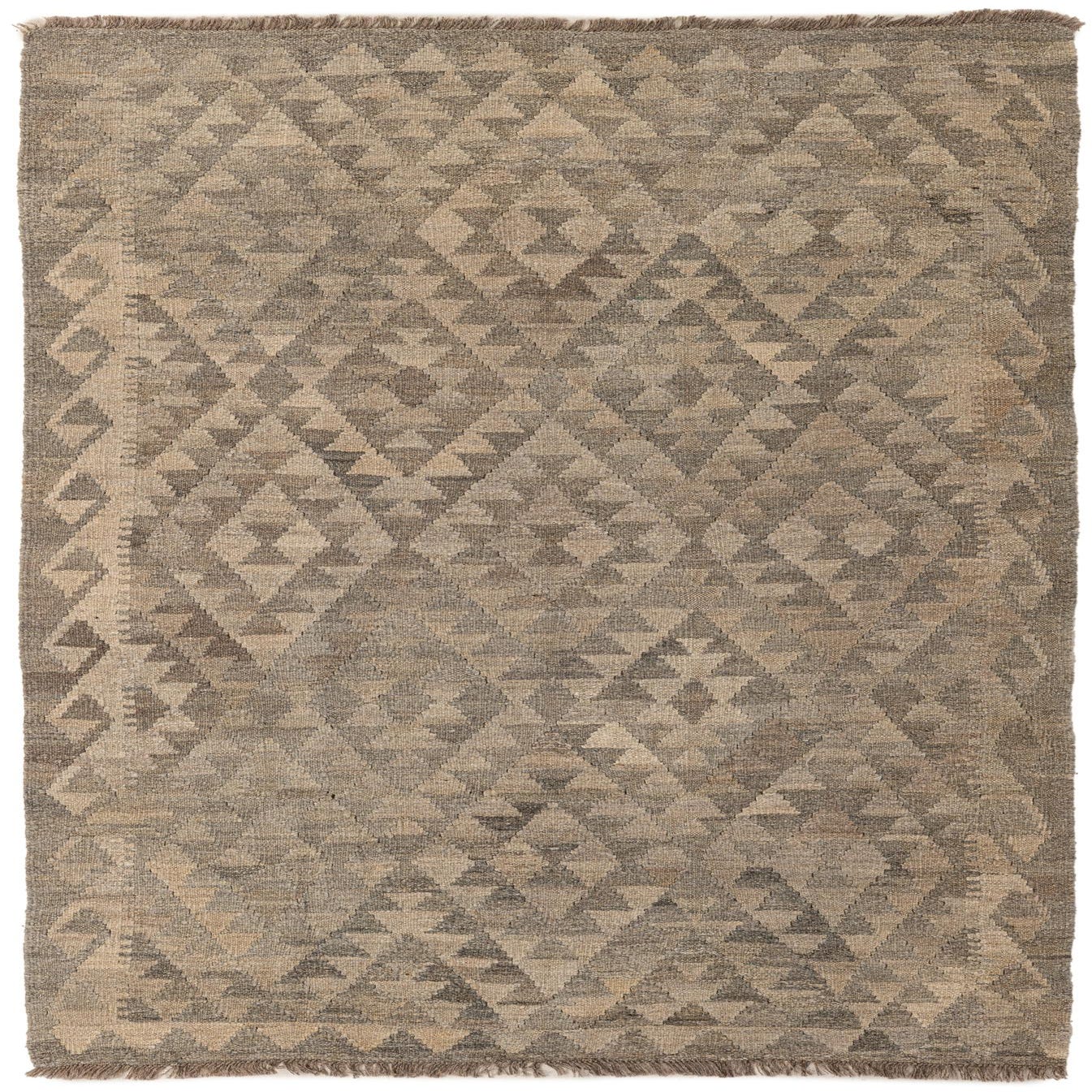 A 4x6 rectangular Kilim Maymana rug with a tribal geometric pattern in varying shades of gray, perfect for an entryway.