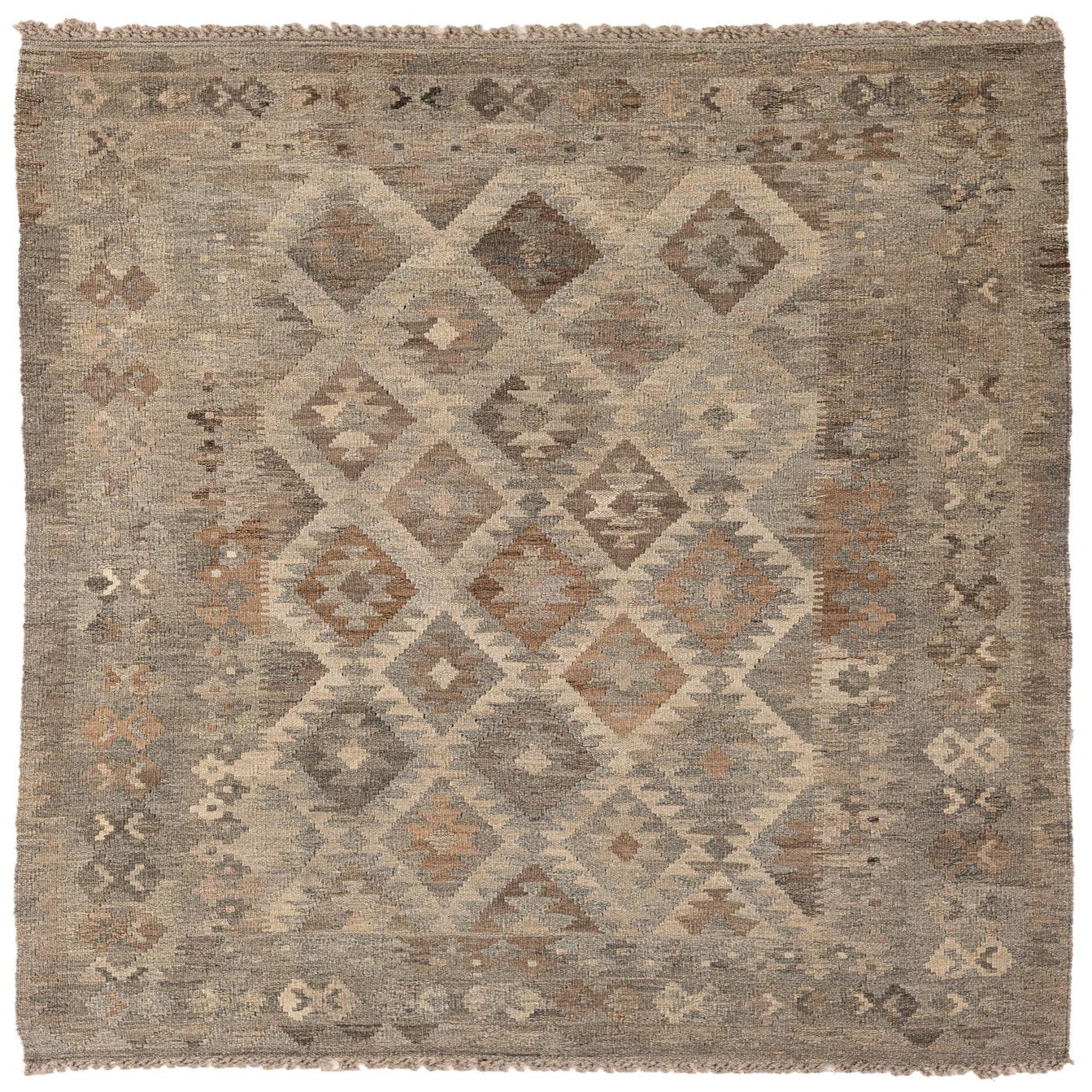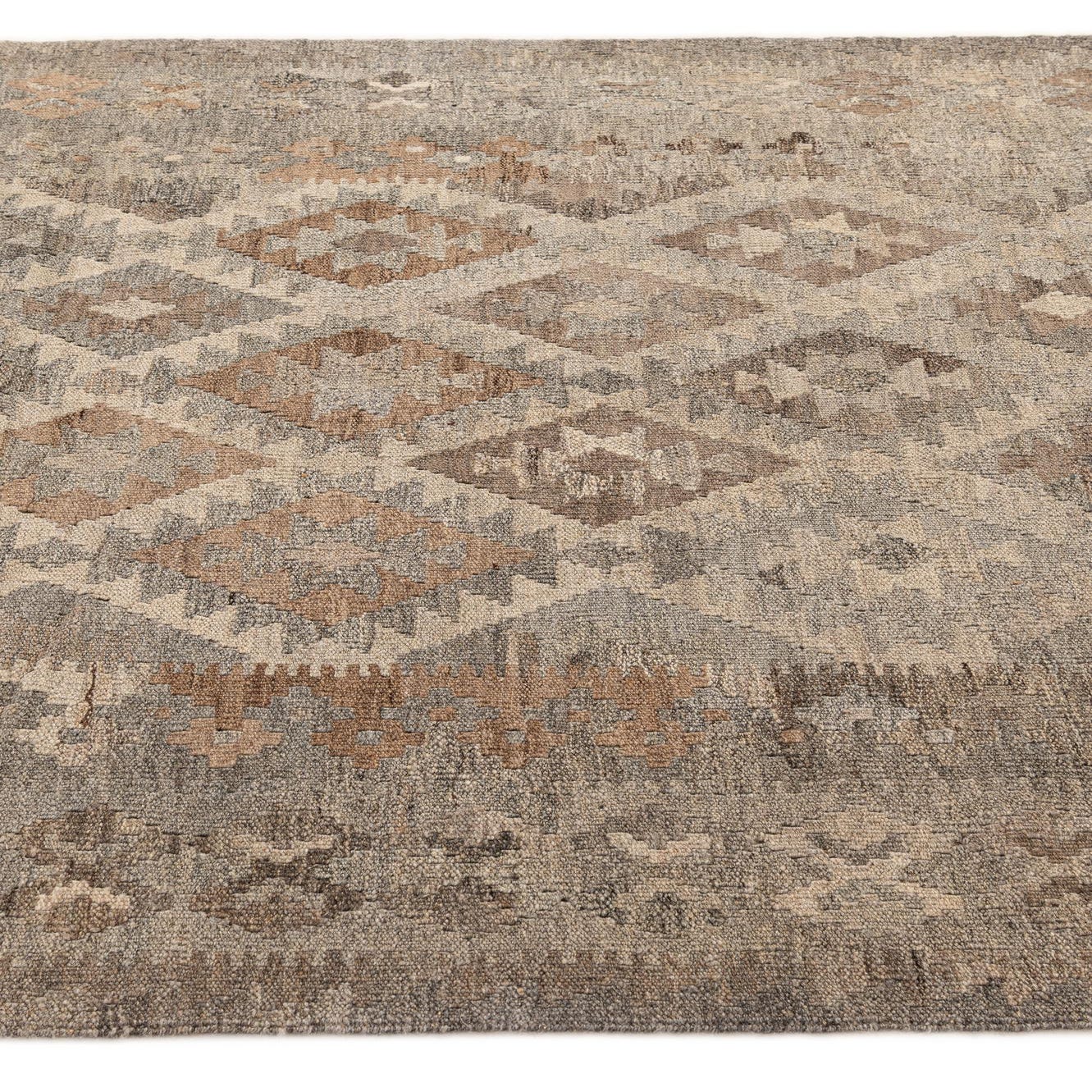 A 4x6 rectangular gray wool flatweave rug with a tribal diamond pattern in varying shades of gray, silver, and brown.