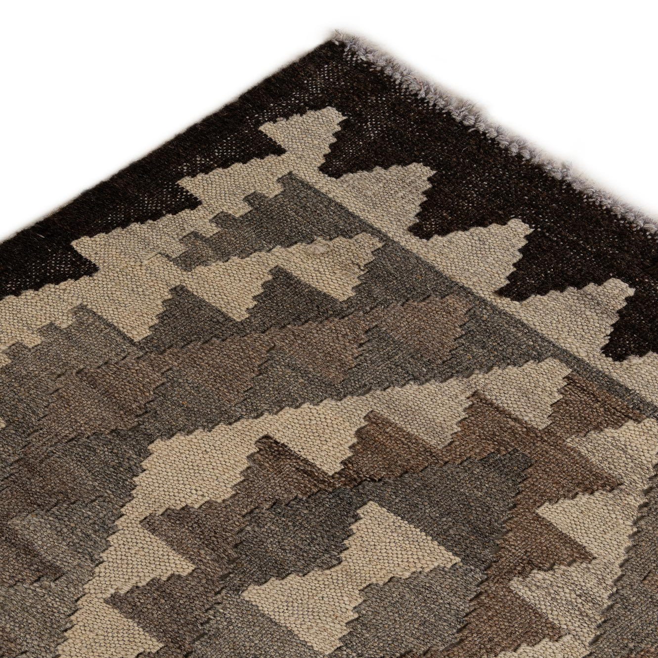 A 4x6 rectangular Kilim Maymana rug featuring a tribal geometric pattern in various shades of gray and silver with a dark border.