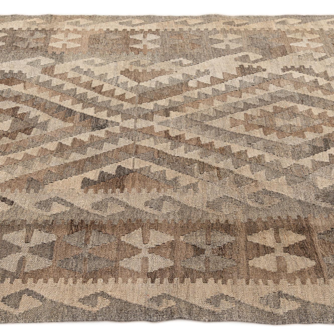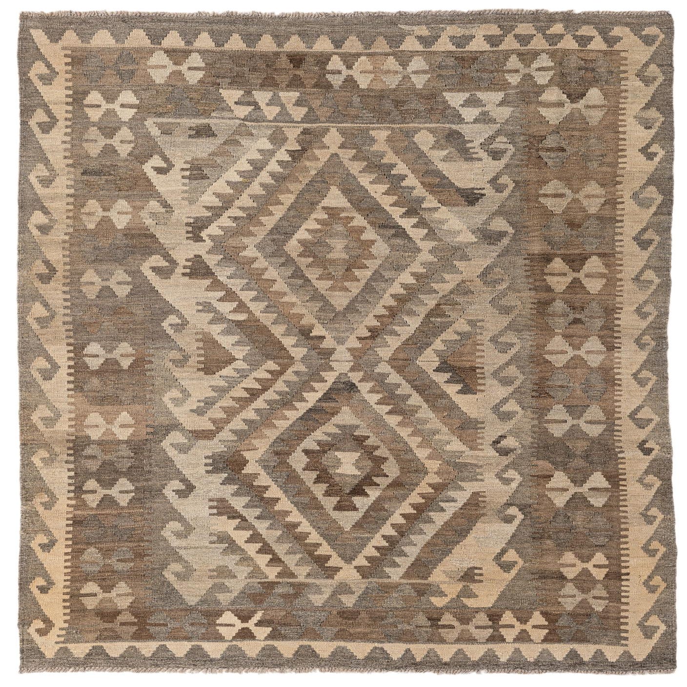 A 4x6 rectangular Kilim Maymana rug featuring a tribal geometric pattern in shades of gray and beige.
